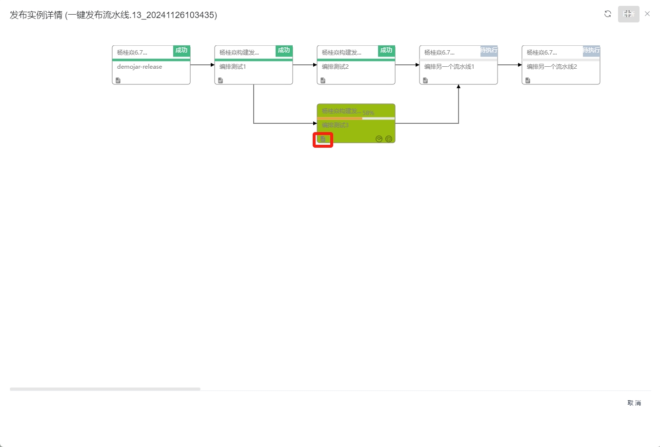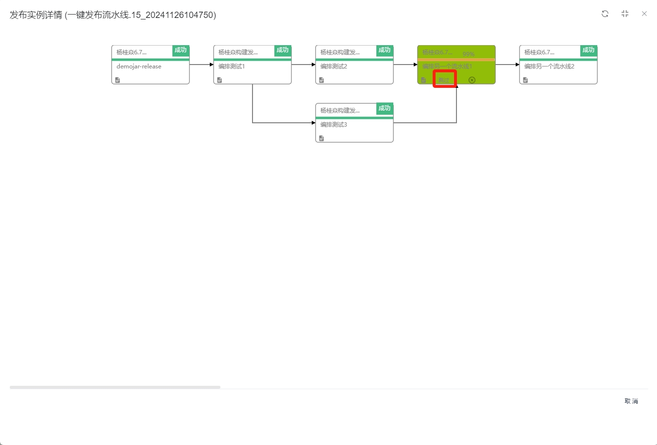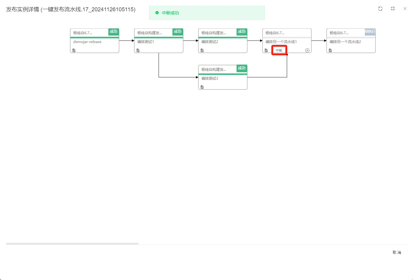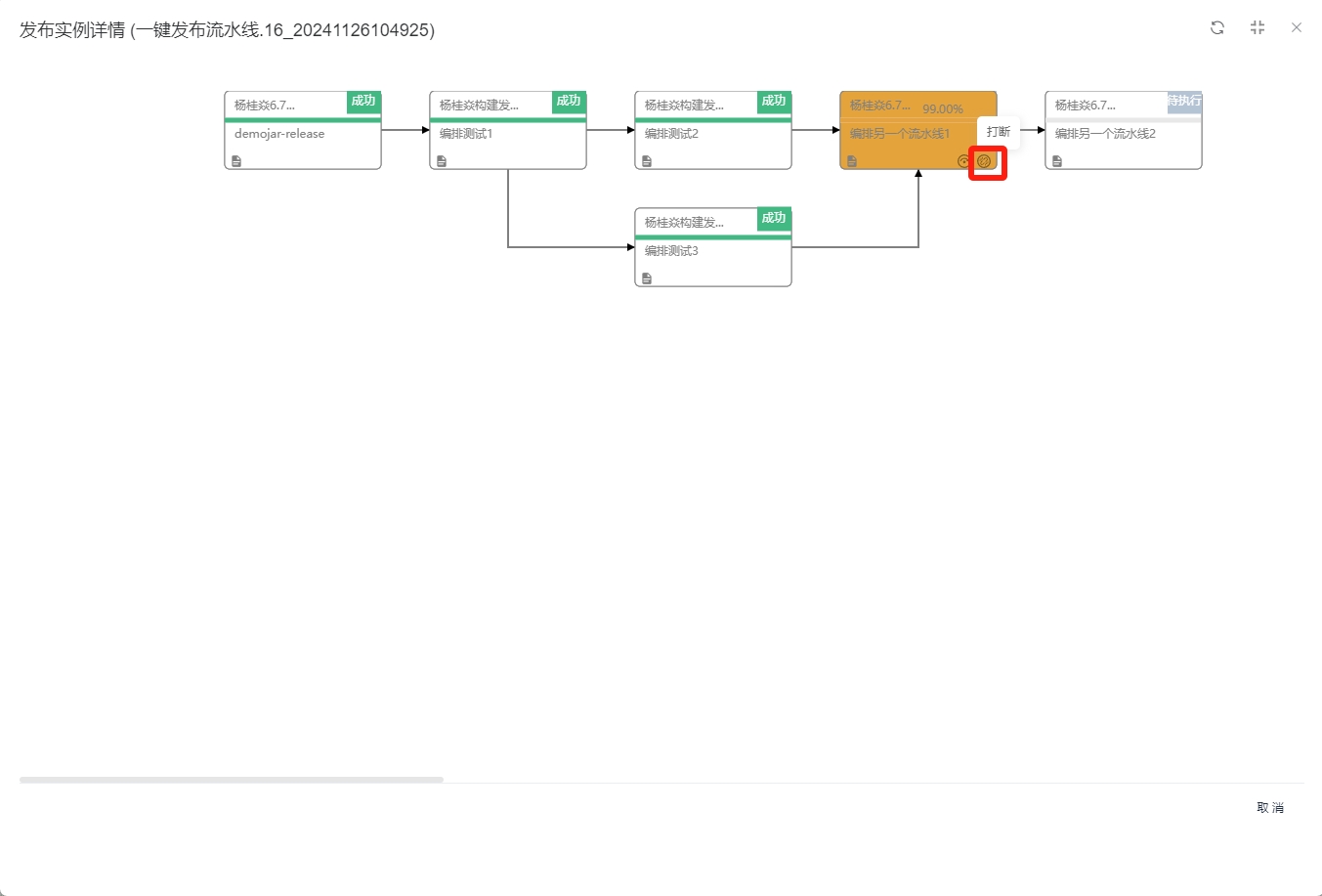 点击打断按钮即可中止该发布流水线以及后续关联的发布流水线。