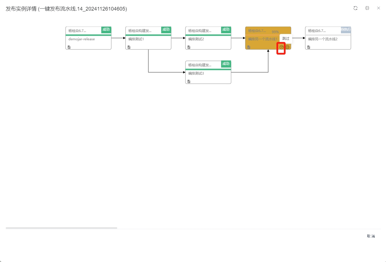 运行中的关联流水线可以看到多了两个按钮,左边的按钮是跳过按钮。
