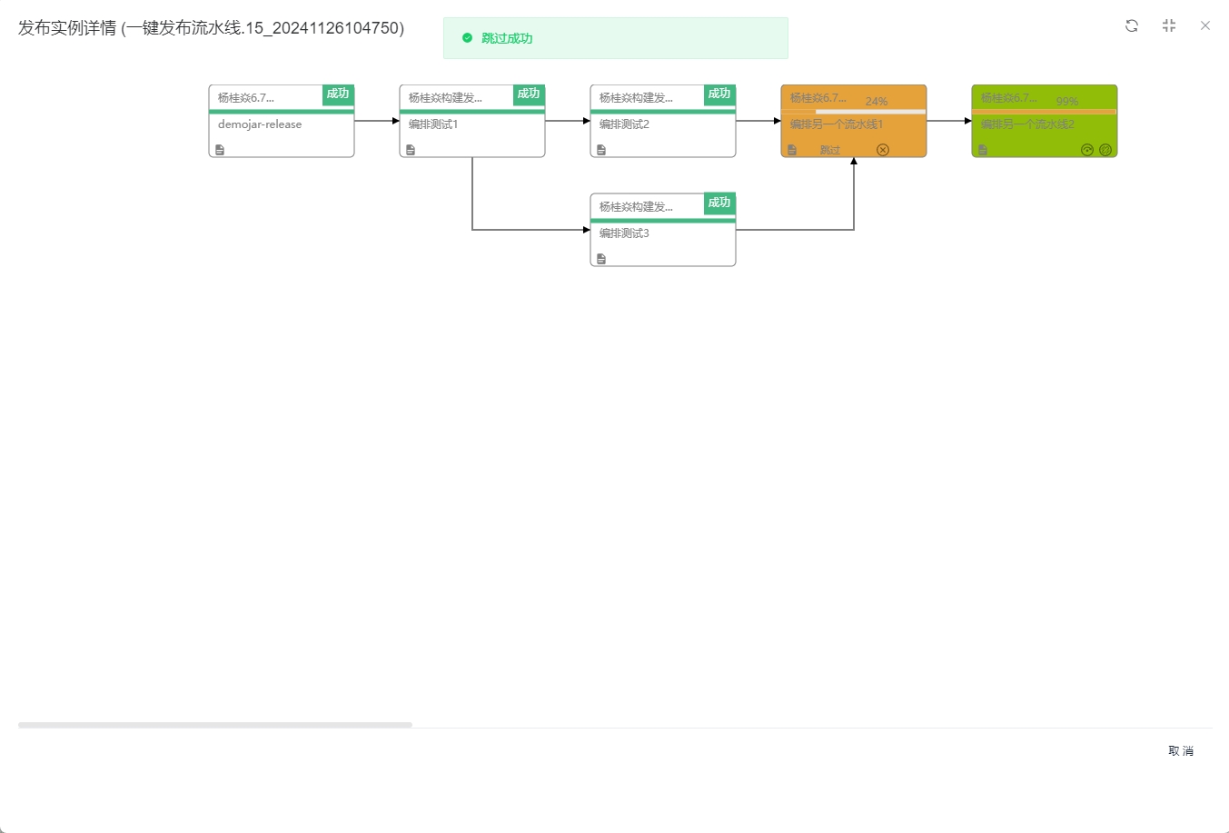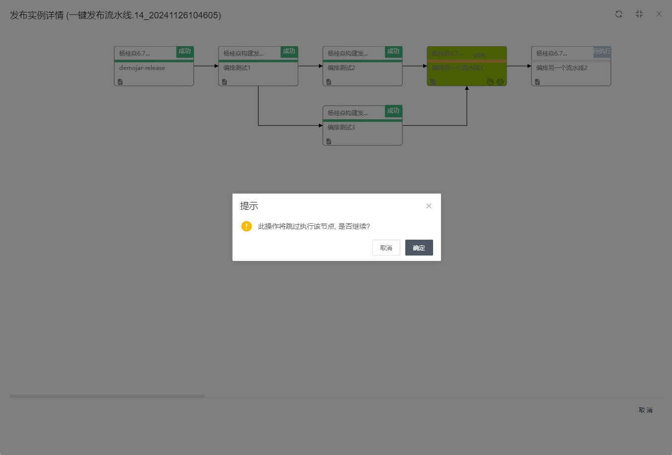点击跳过按钮可以忽略当前关联流水线的结果,直接进行编排中下一个步骤。