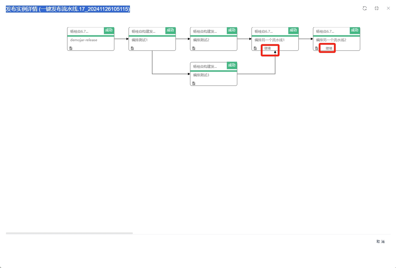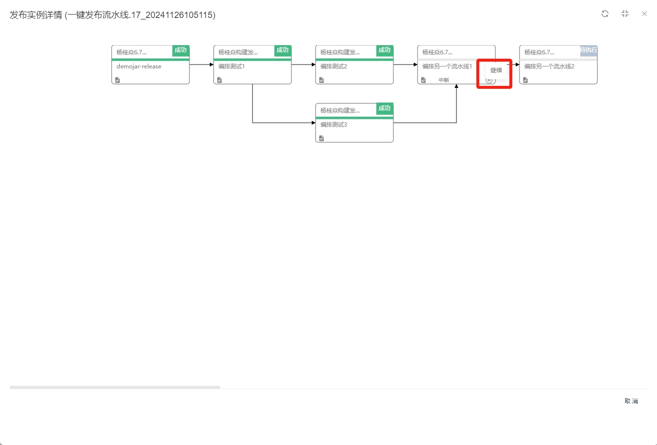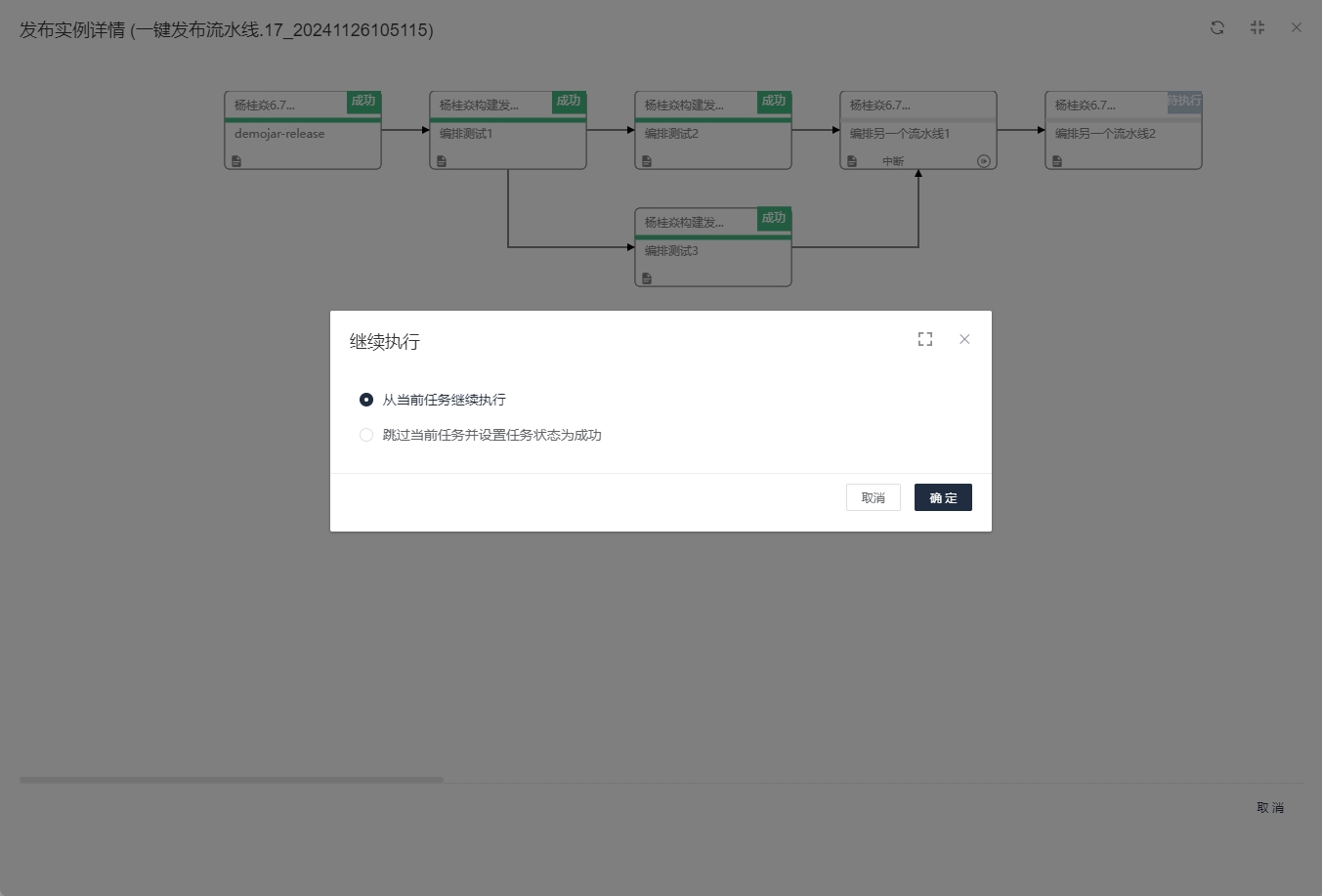 选择从当前任务继续执行时,会重新执行当前以及后续关联流水线,涉及到的流水线标识为继续。