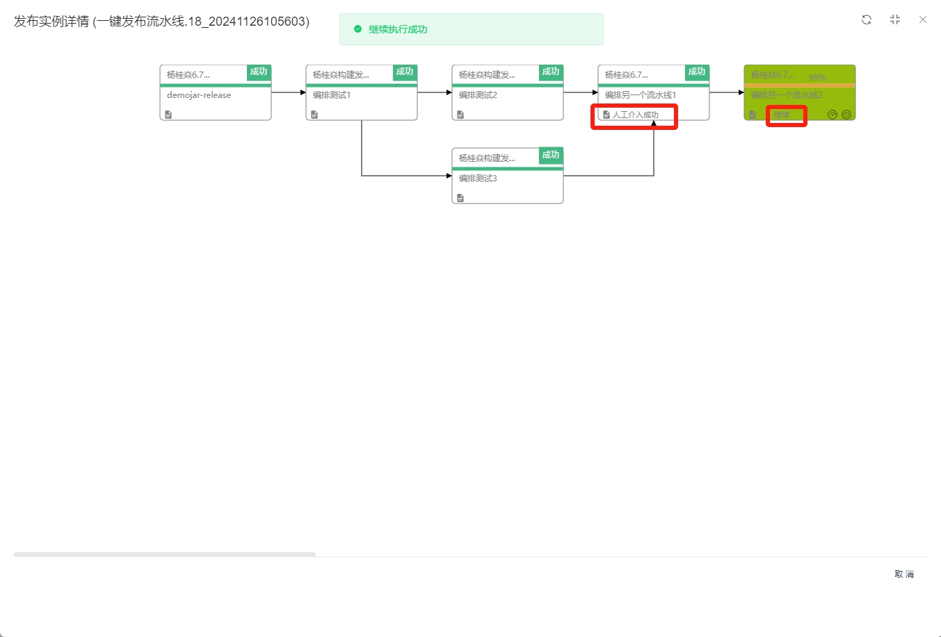 如果人工在对应项目流水线处理了中断流水线的发布,可以选择跳过当前任务并设置状态为成功,继续执行后续流水线,当前中断流水线会标识为人工介入成功。