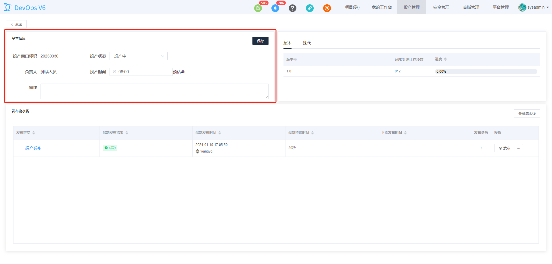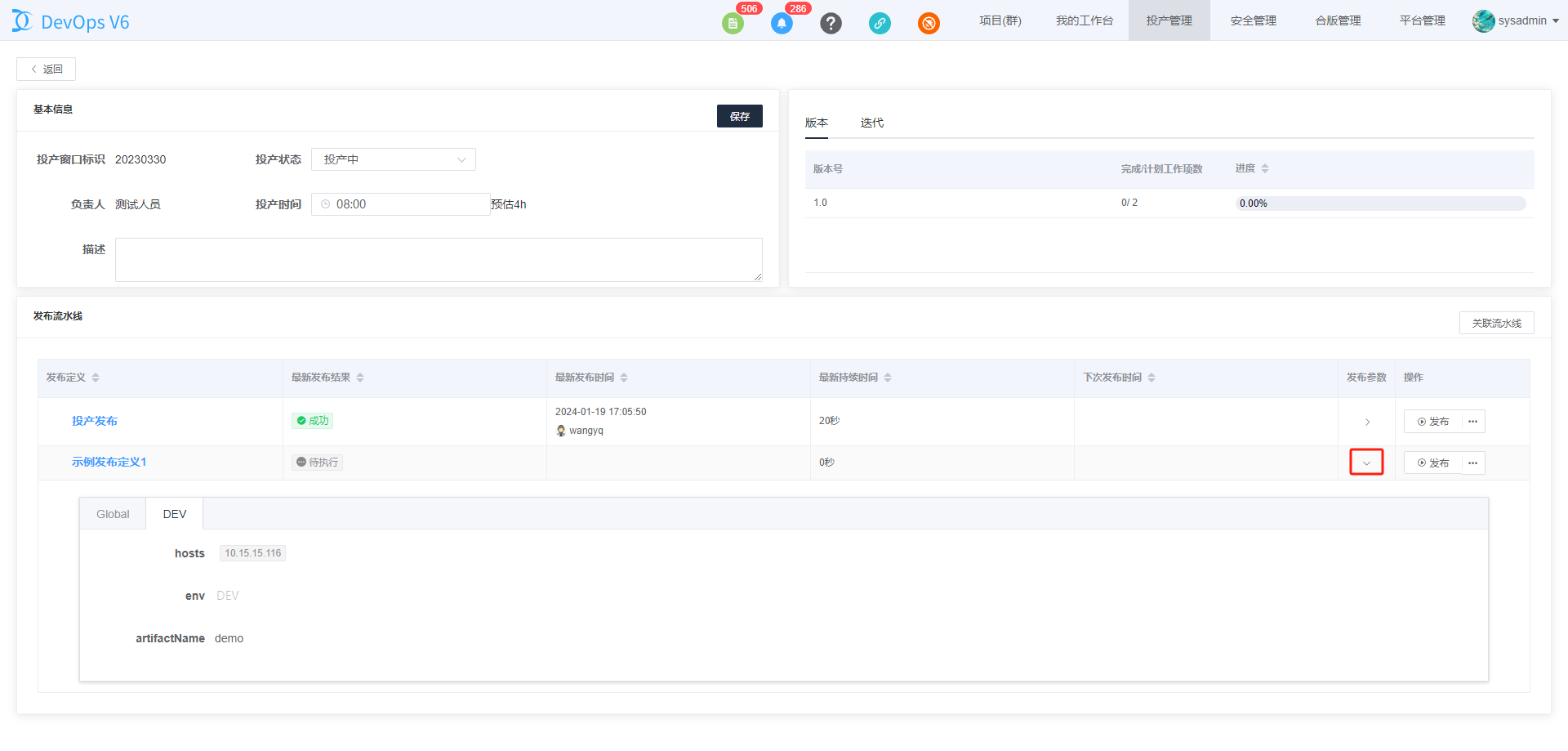 点击发布参数三角按钮,可以浏览投产流水线预设的投产参数。