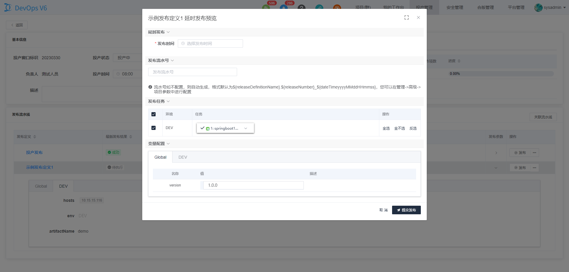 已关联的流水线支持延时发布,会根据配置的时间创建定时任务,在指定时间执行投产流水线,可以在平台管理-高级-定时页面取消延时发布。