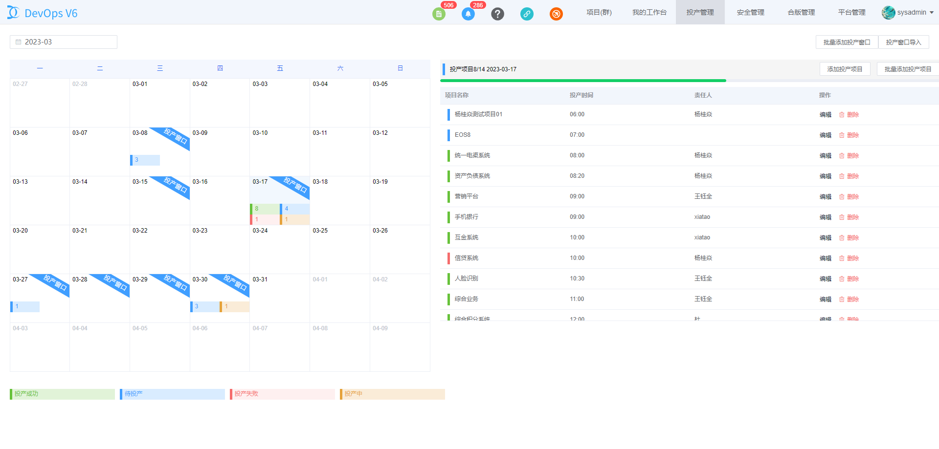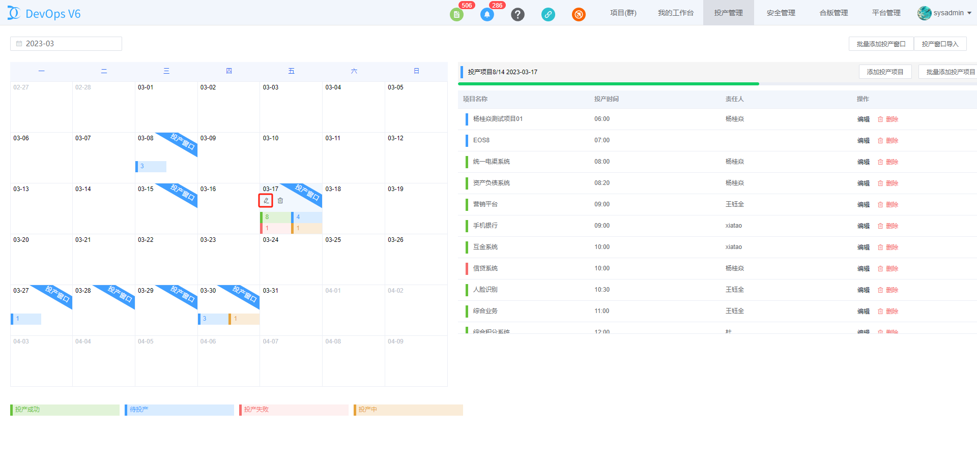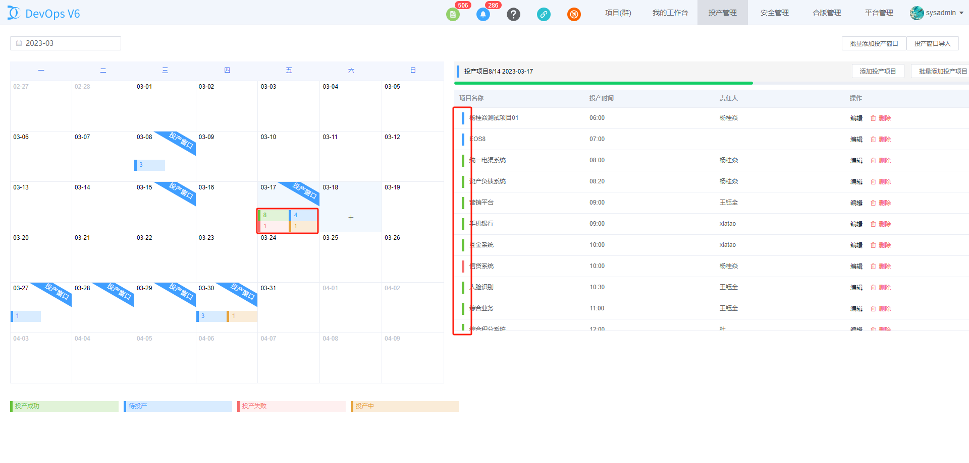 投产管理员可以在该页面对投产窗口进行管理,图中圈出区域的不同颜色背景的数字代表不同状态的投产项目的数量, 其中蓝色为待投产的投产项目数量,黄色为投产中的投产项目数量,绿色为投产成功的投产项目数量,红色为投产失败的投产项目数量。