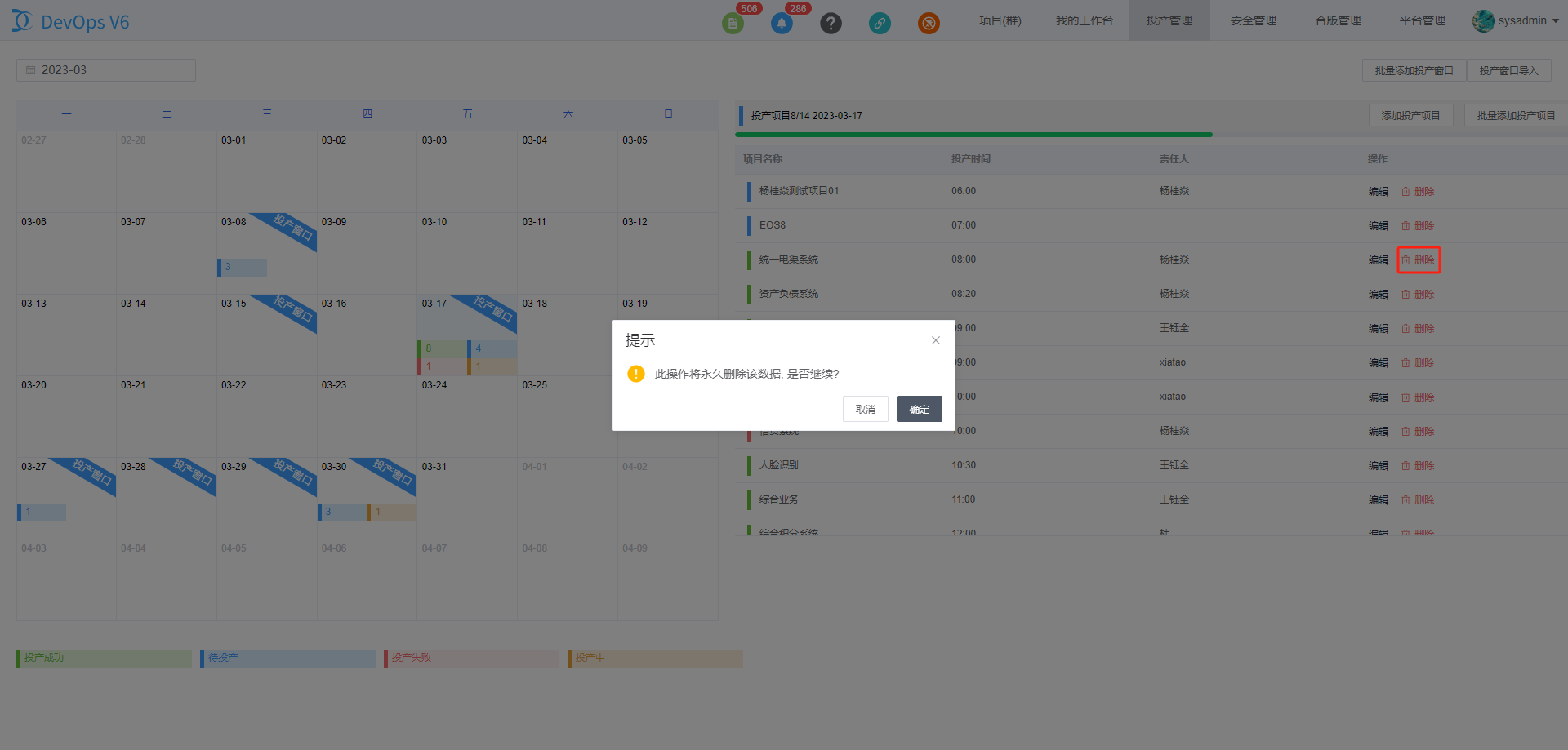 点击投产项目后的删除按钮,可以删除指定投产项目。