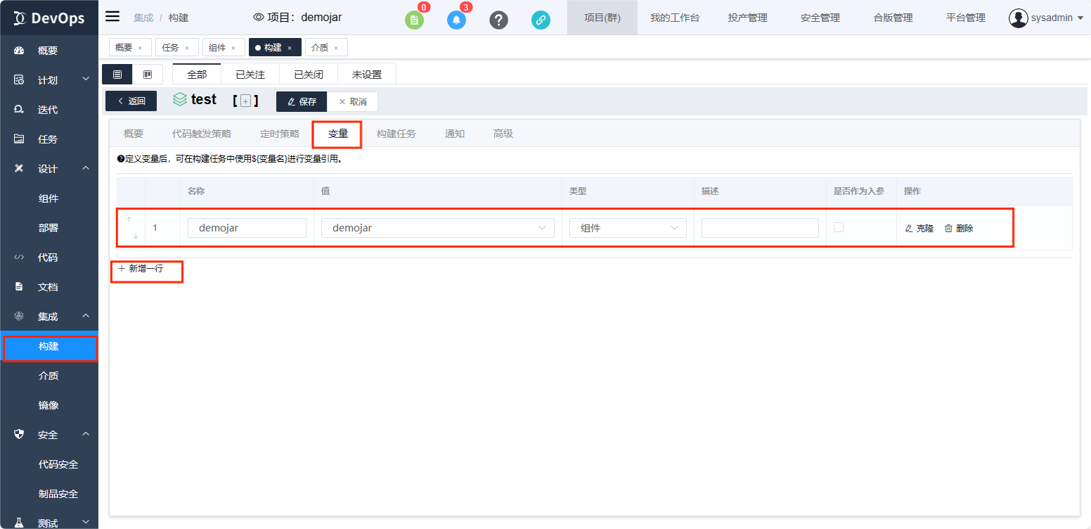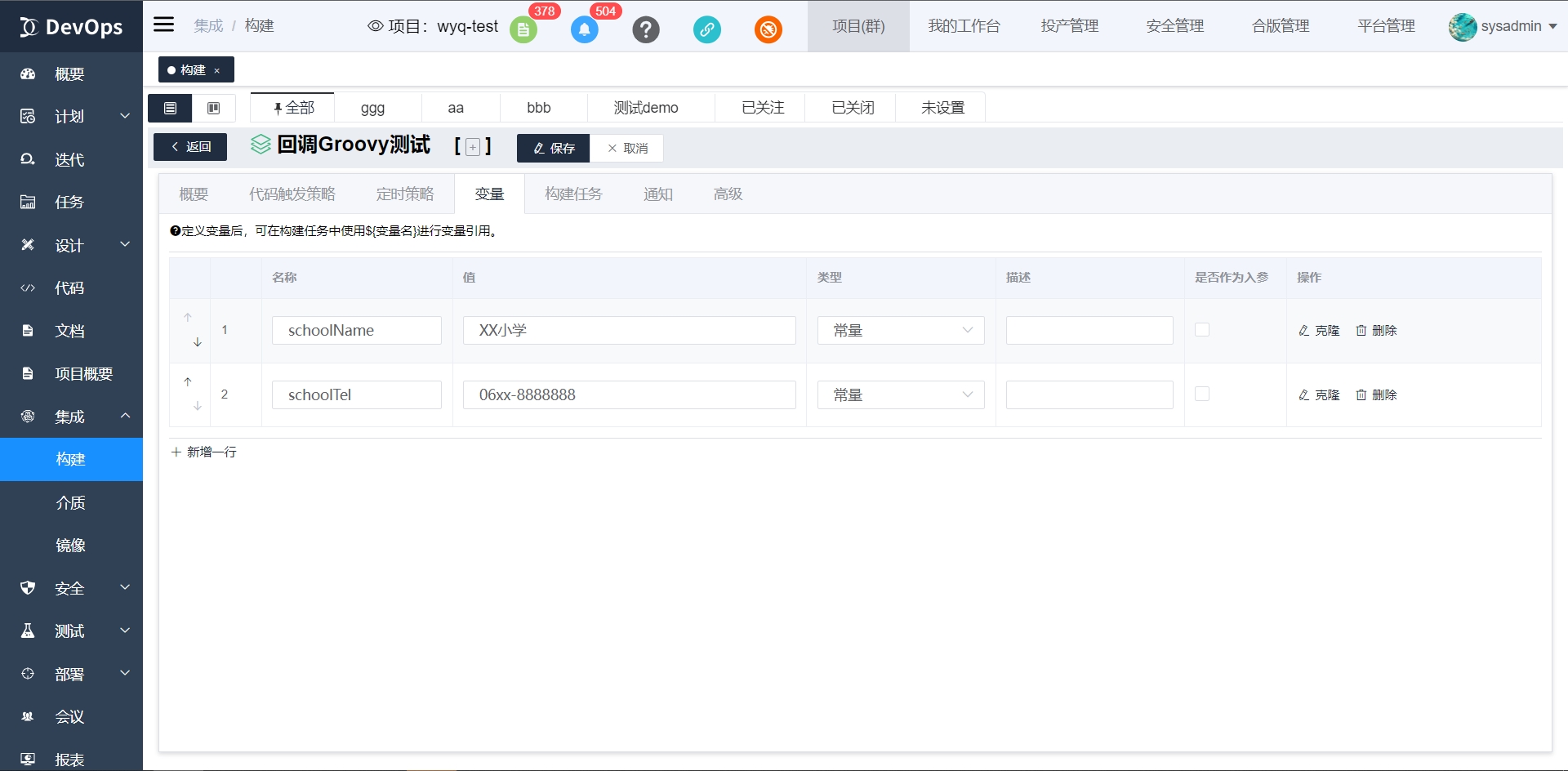 是否作为入参:勾选即可在构建时页面更新变量,为否则仅供查看