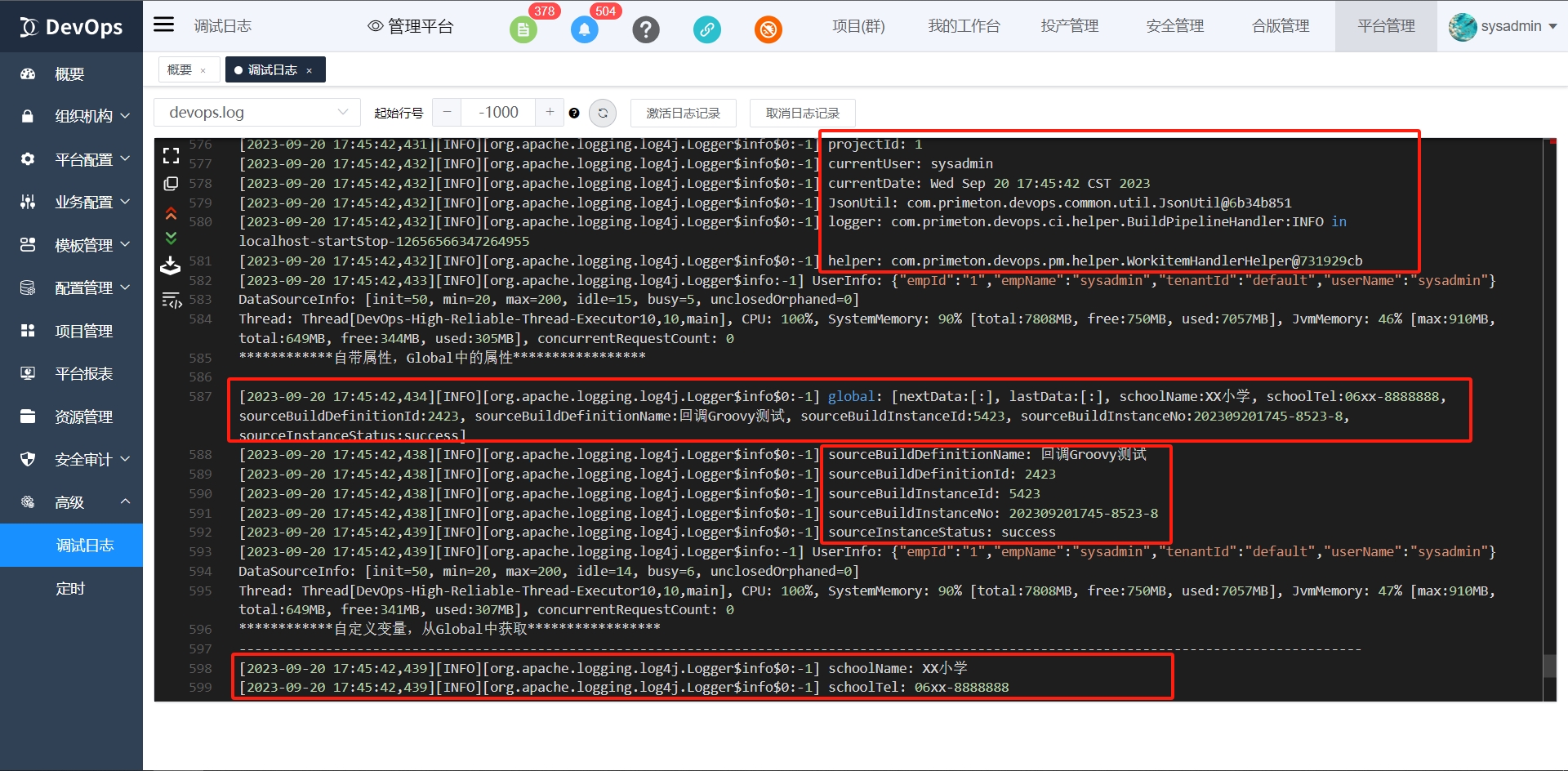 logger.info("************自带属性*****************") logger.info("projectId: ${projectId}") // 当前项目ID logger.info("currentUser: ${currentUser}") // 执行当前流水线的用户名 logger.info("currentDate: ${currentDate}") // 当前时间 logger.info("JsonUtil: ${JsonUtil}") // JSON工具实例 logger.info("logger: ${logger}") // logger日志实例 logger.info("helper: ${helper}") // WorkitemHandlerHelper实例 logger.info("************自带属性,Global中的属性*****************") logger.info("global: ${global}") logger.info("sourceBuildDefinitionName: ${global.sourceBuildDefinitionName}") // 当前构建定义名称 logger.info("sourceBuildDefinitionId: ${global.sourceBuildDefinitionId}") // 当前构建定义ID logger.info("sourceBuildInstanceId: ${global.sourceBuildInstanceId}") // 当前构建实例ID logger.info("sourceBuildInstanceNo: ${global.sourceBuildInstanceNo}") // 当前构建实例编号 logger.info("sourceInstanceStatus: ${global.sourceInstanceStatus}") // 当前流水线状态 logger.info("************自定义变量,从Global中获取*****************") logger.info("schoolName: ${global.schoolName}") logger.info("schoolTel: ${global.schoolTel}")执行结果