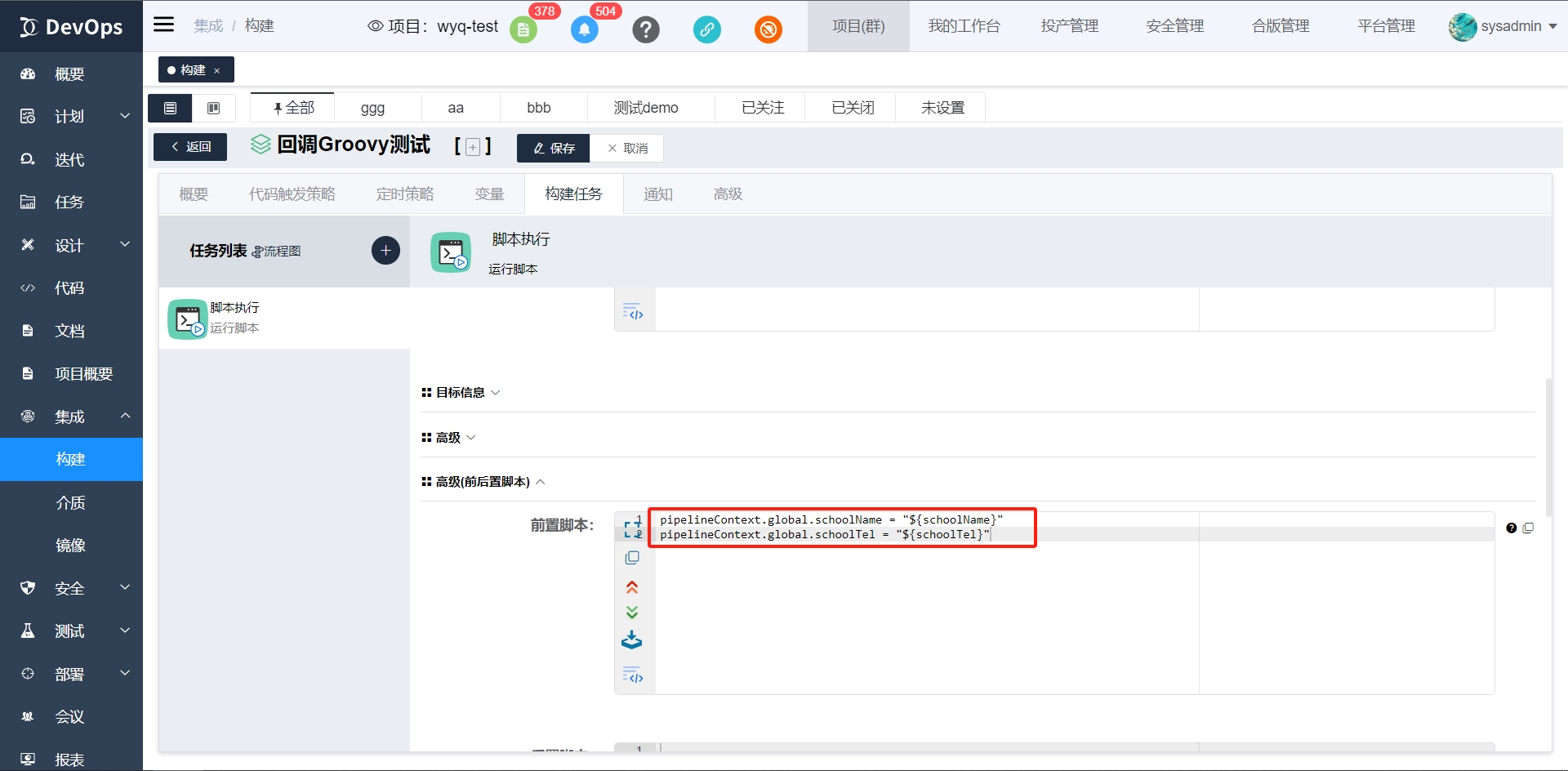 2、流水线任务执行开始时,除了脚本执行任务能设置是否计算属性值外,其他任务均默认使用pipeline,pipelineContext,globalData,pipelineResult,stageAttrs,stageResult进行属性值计算(不只是值替换,还可以执行方法)。 各内置变量说明如下: 1)pipeline:流水线,主要用来调用流水线的公共方法 2)pipelineContext:流水线上下文 userPlatformParams:用户平台参数 userProjectParams: 用户项目参数 params:用户定义的变量 buildNo:编译号 global:全局数据区 3)globalData:全局数据区数据,也可以通过pipelineContext.global获取 4)pipelineResult:流水线结果 5)stageAttrs:流水线任务属性 6)stageResult:流水线任务结果