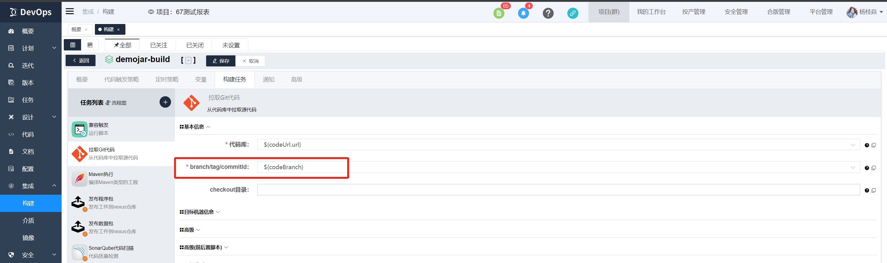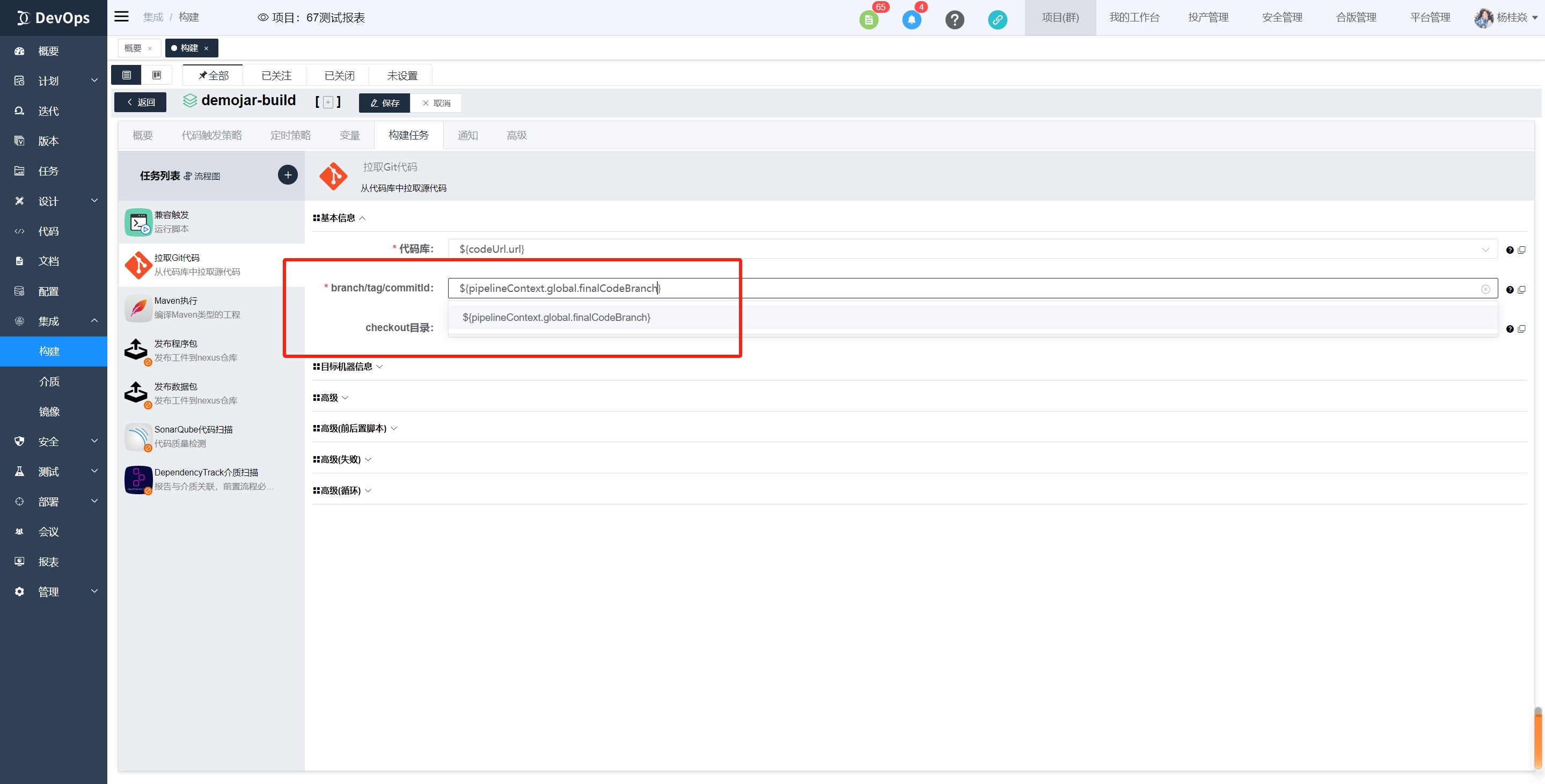2)代码打Tag任务:pipelineContext.global.codeRepositoryTagName = stageResult.tagName;后续任务可以直接用${pipelineContext.global.codeRepositoryTagName}这种方式使用打的Tag号。