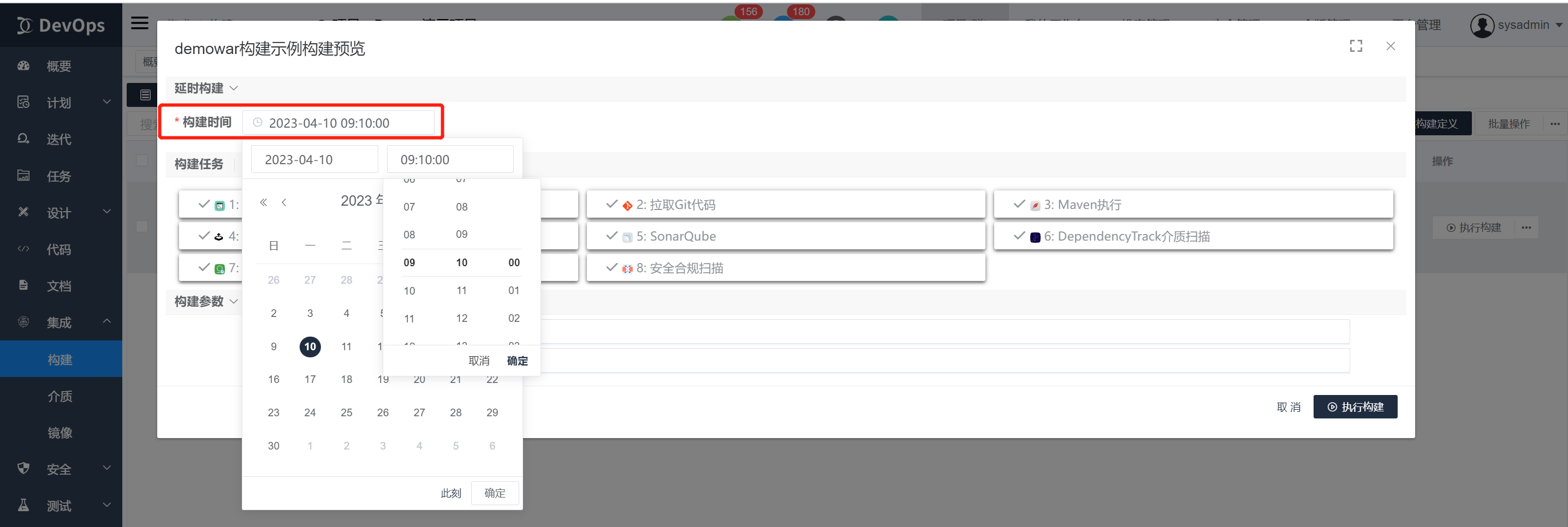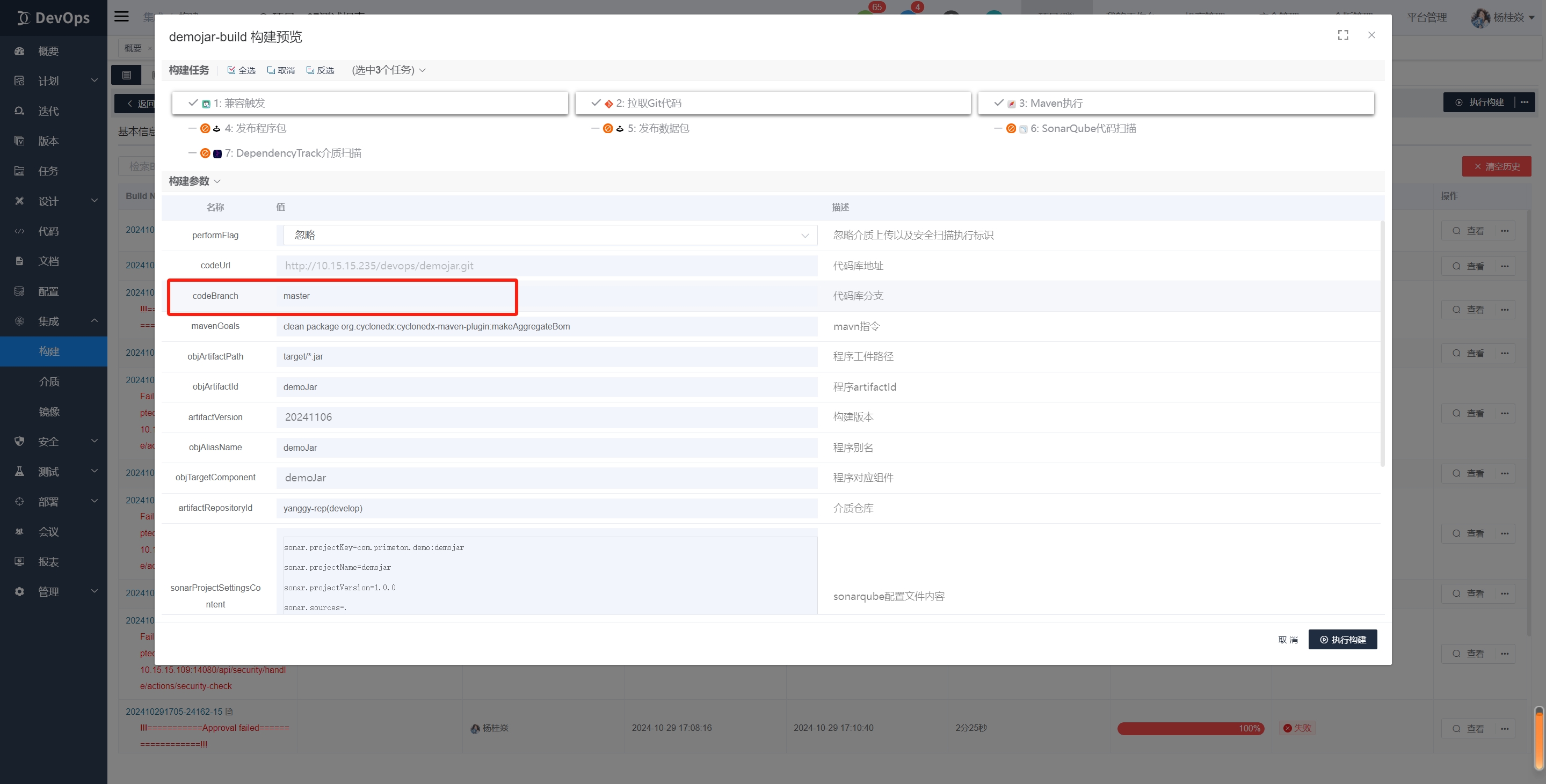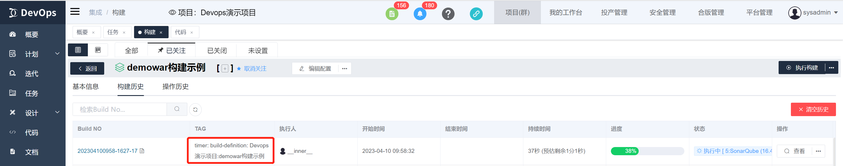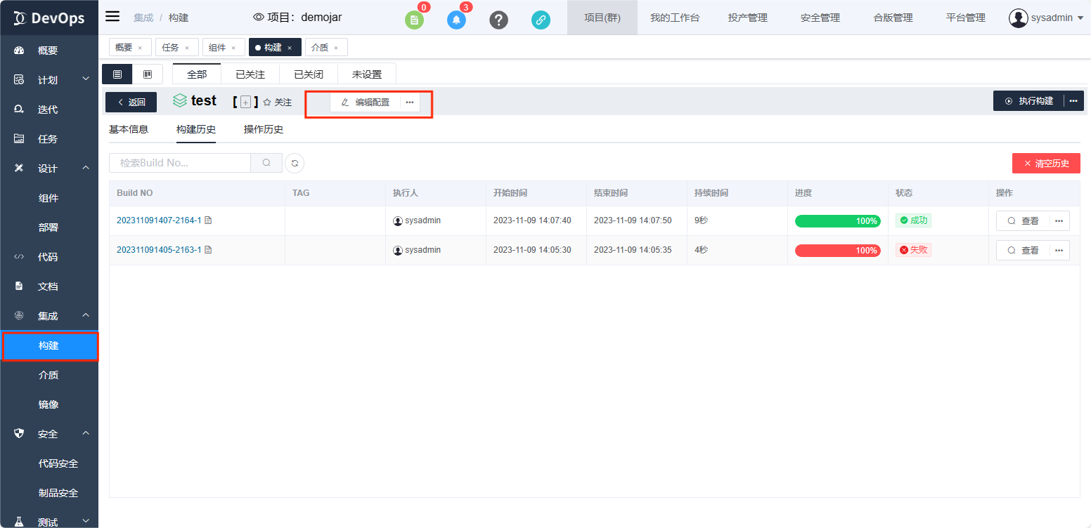 执行sonarqube代码扫描,可以自行配置sonar配置文件内容,不配置将读取目标路径文件,构建执行结束可以在构建历史》质量中查看代码质量报告