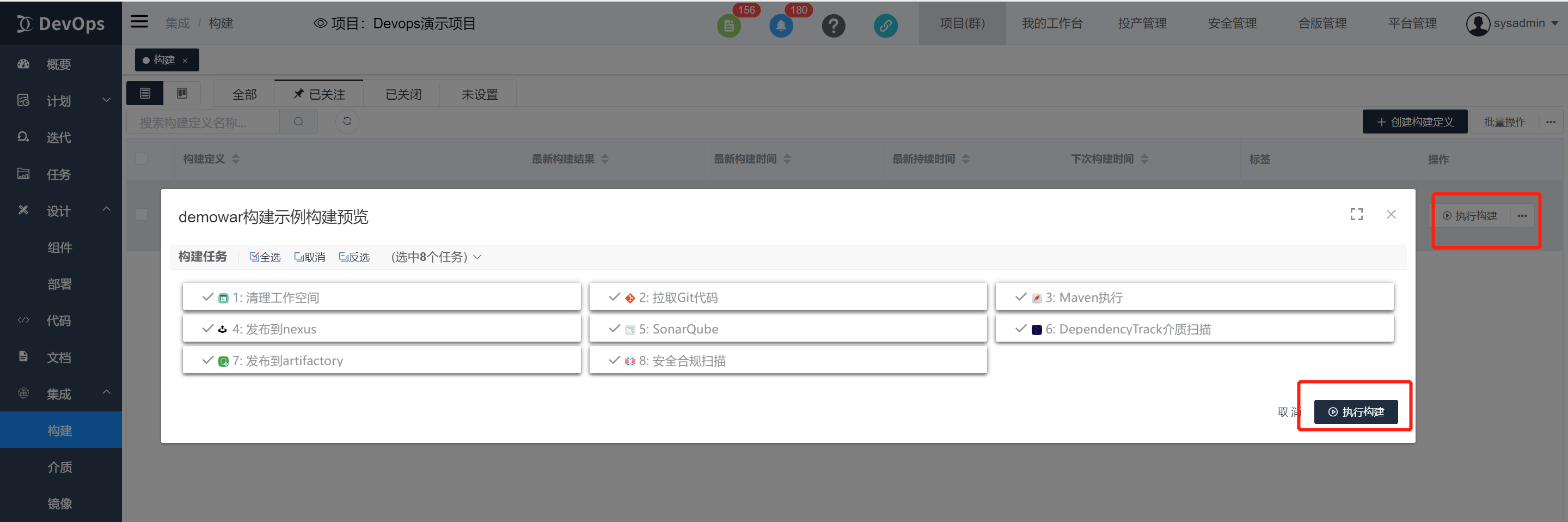 执行DependencyTrack介质扫描,bom文件有maven构建原子任务生成,也可以代码库中包含,然后在此指定文件位置。构建执行结束可以在构建历史》安全合规信息中查看物料清单质量