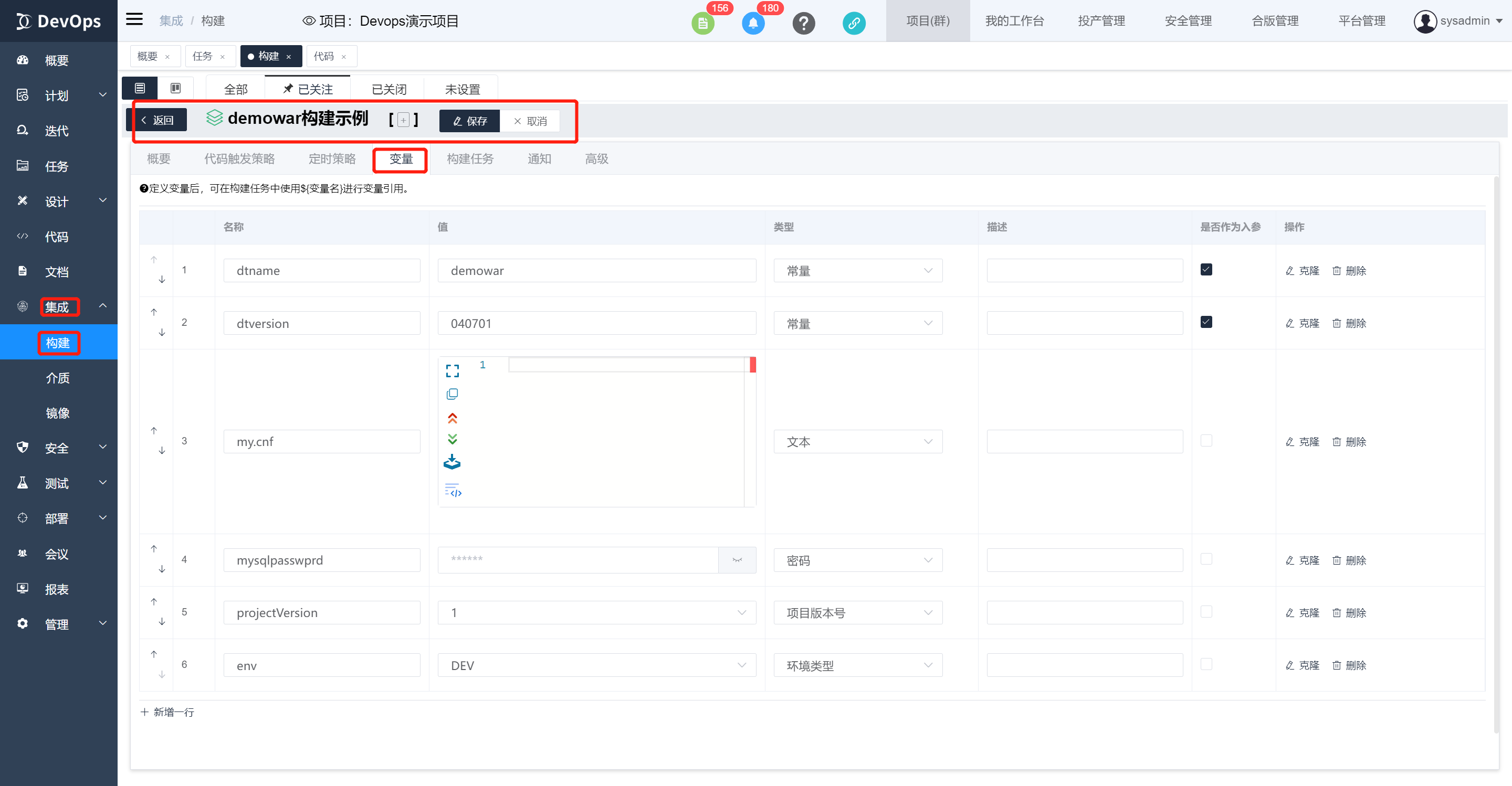 类型:预设了多种类型适用不同场景,如基础类型:常量、密码、文本等可用于更新文件配置内容;枚举类型:环境类型等可用于数据范围限定,数据显示;以及项目数据:项目,代码库,项目版本号等用于引用项目参数等