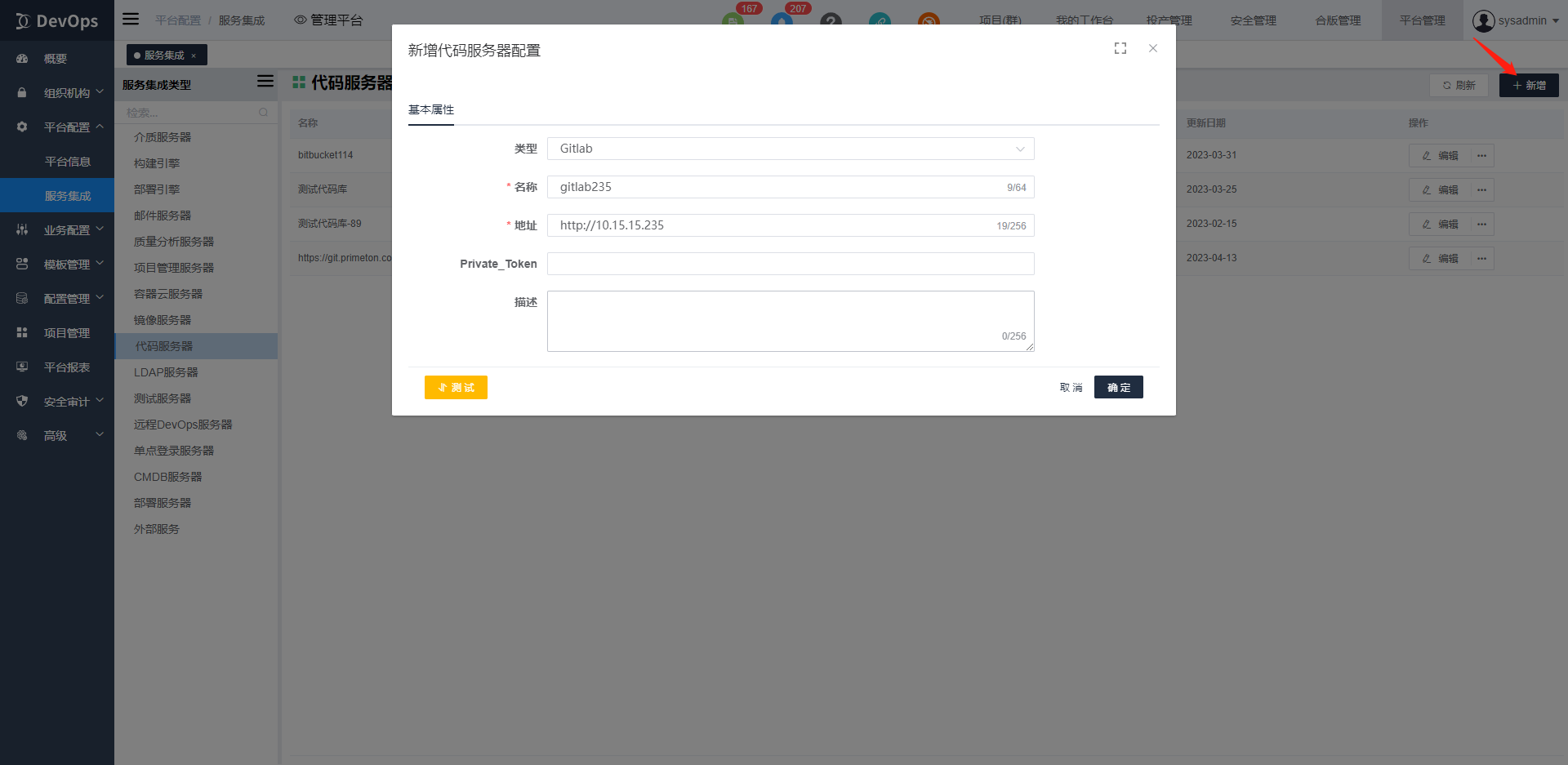 eg. 以Gitlab类型举例,保证代码库名称唯一,配置正确的代码库地址,Private_Token无需填写。