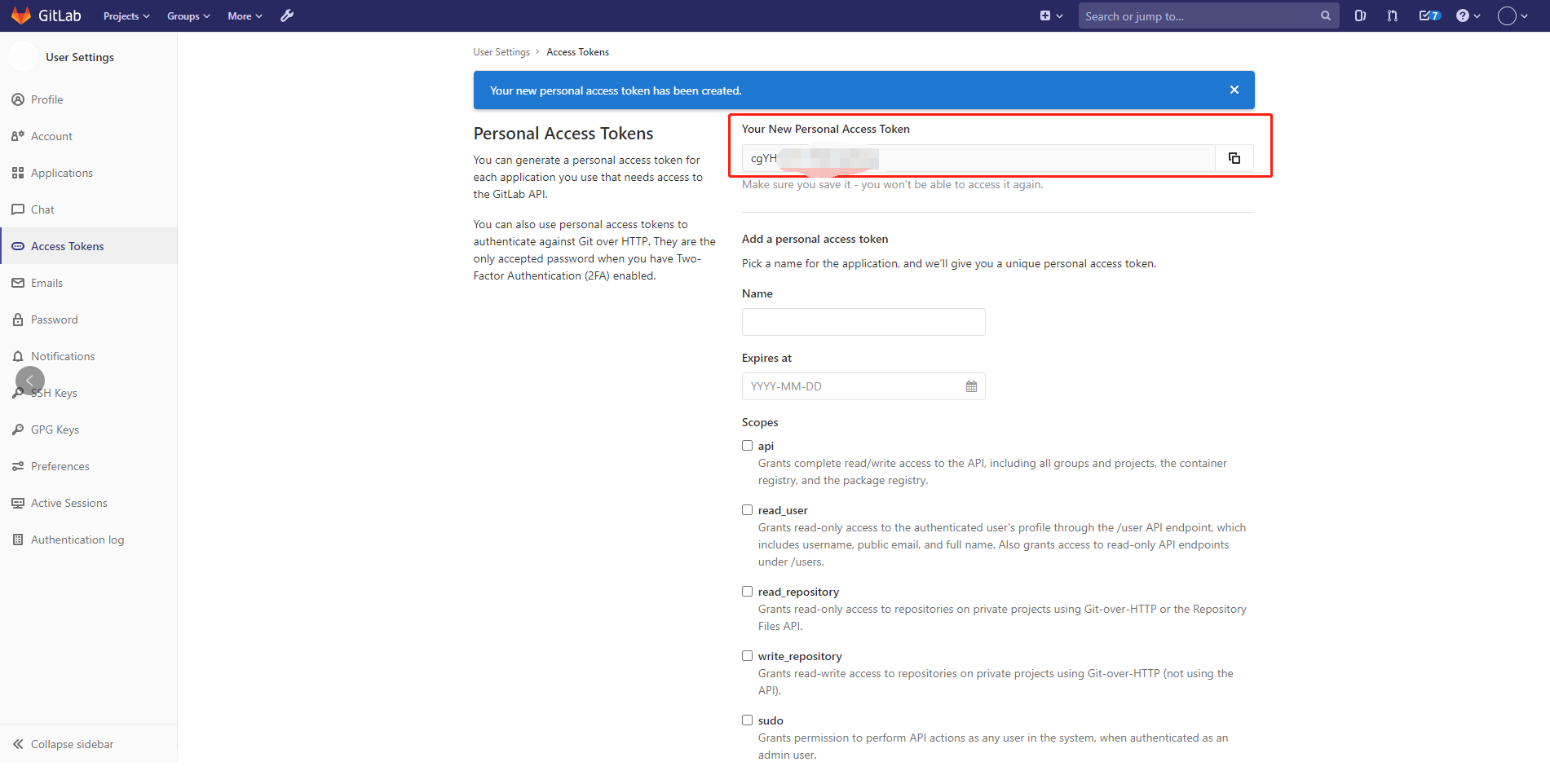 以Gitlab12.4举例,如图,进入Gitlab创建Access_Token页面,勾选api权限,不需要配置时间。