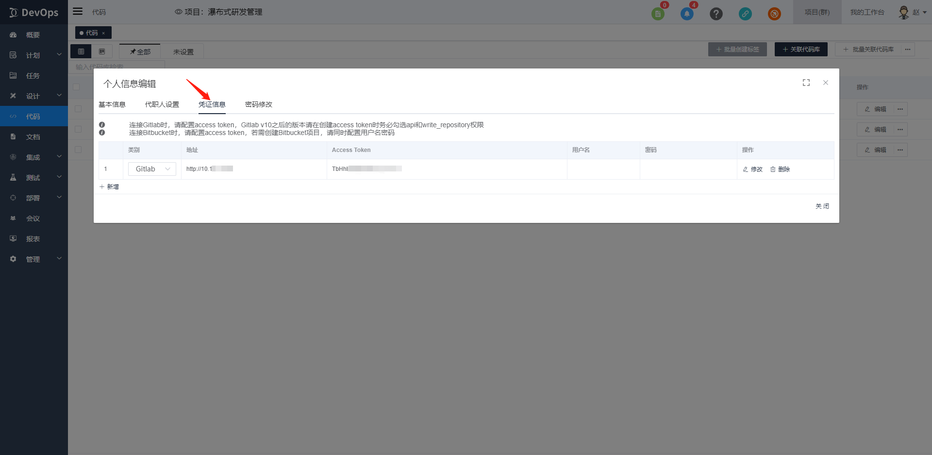 创建好后将Access_Token配置到DevOps用户的个人凭证中。