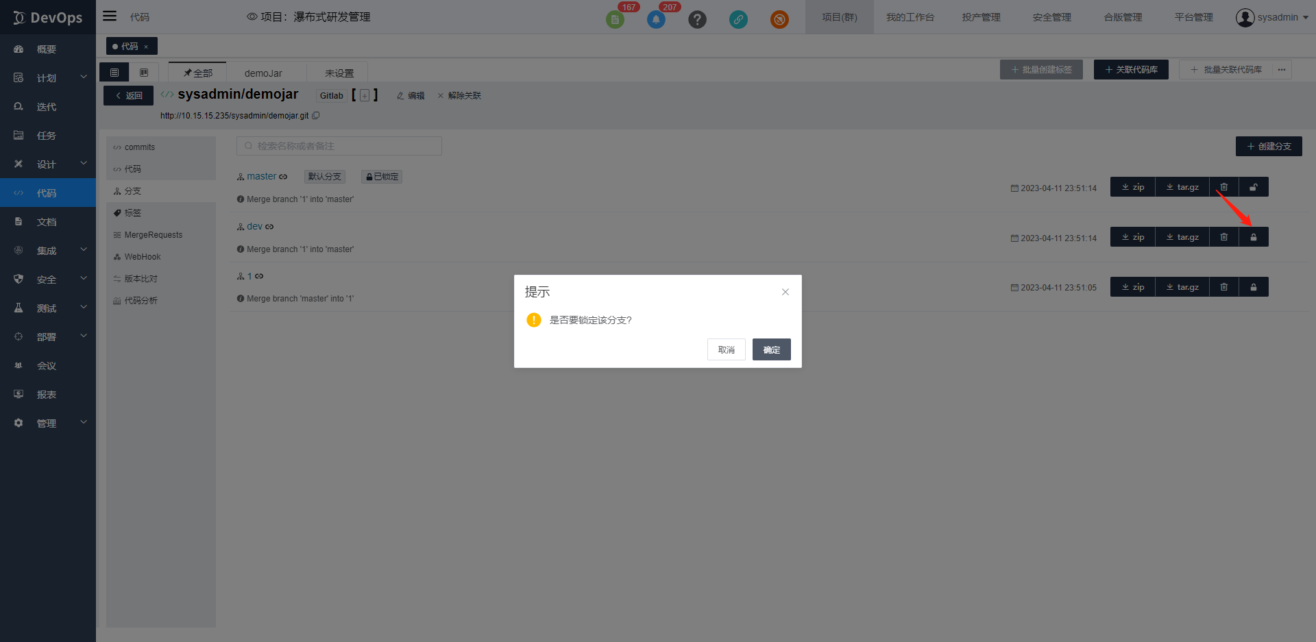 在分支菜单中,项目负责人可以执行新建分支、下载分支源码包、删除分支、锁定分支的功能。