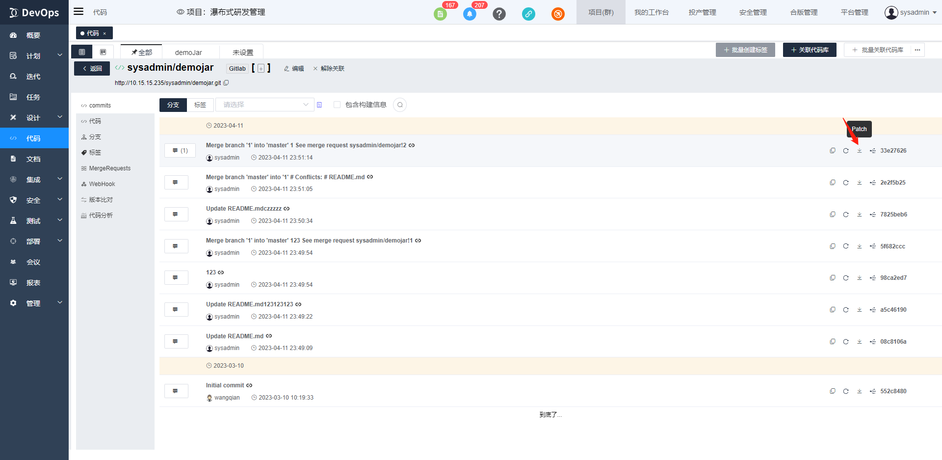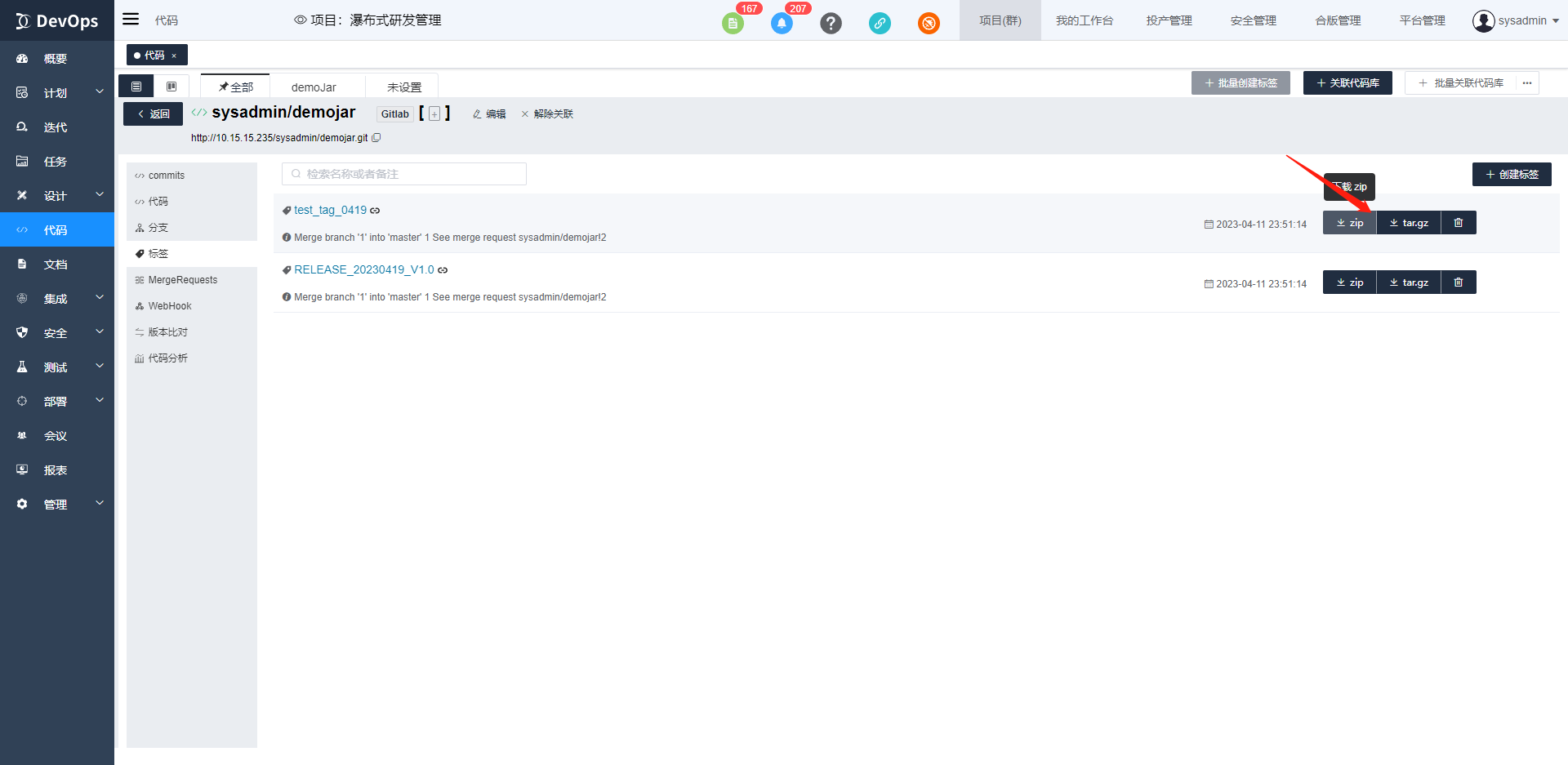 DevOps项目管理中的代码库模块支持将Gitlab、Gihub、Bitbucket、Svn、Tfs关联至项目,并集成了高频功能,方便用户对代码库进行管理,支持对代码库打标签。