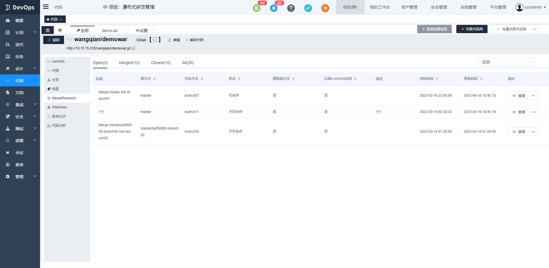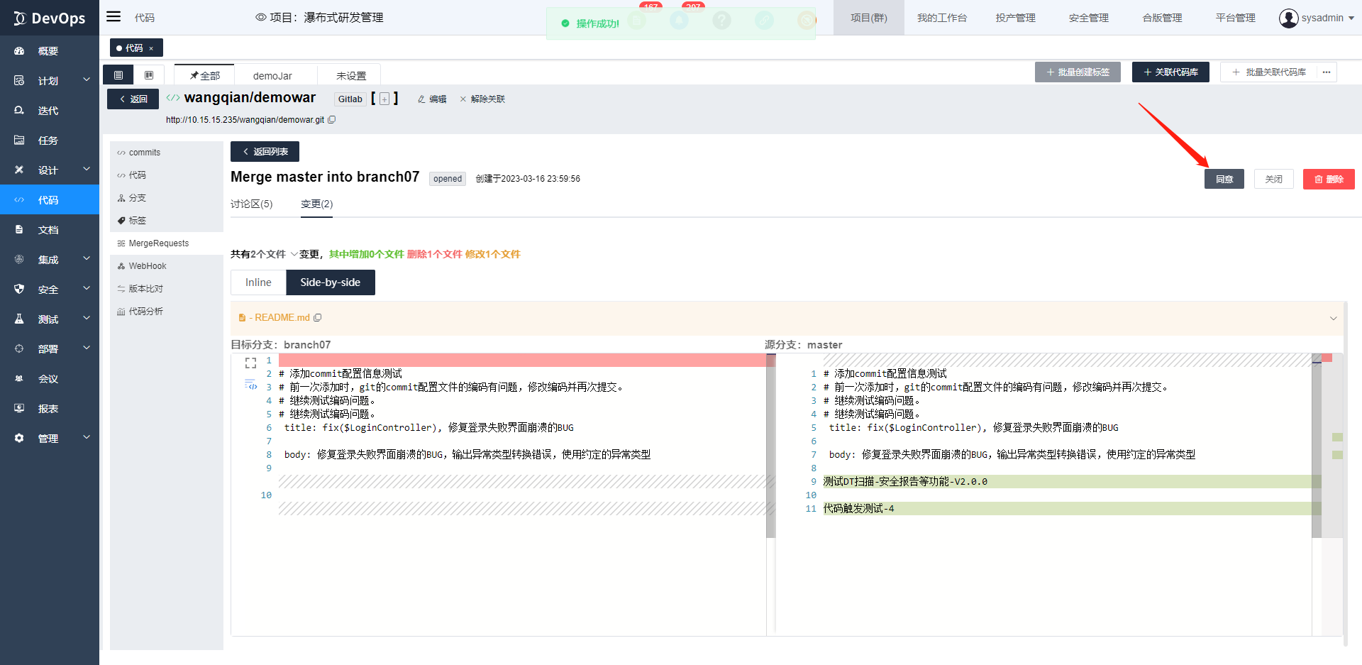 合并请求状态为可合并(代表源码不存在冲突)时,拥有权限的用户可以执行同意合并请求能力来执行代码合并,亦或者拒绝合并,选择关闭合并请求,同样,也可以选择删除创建错误的合并请求。