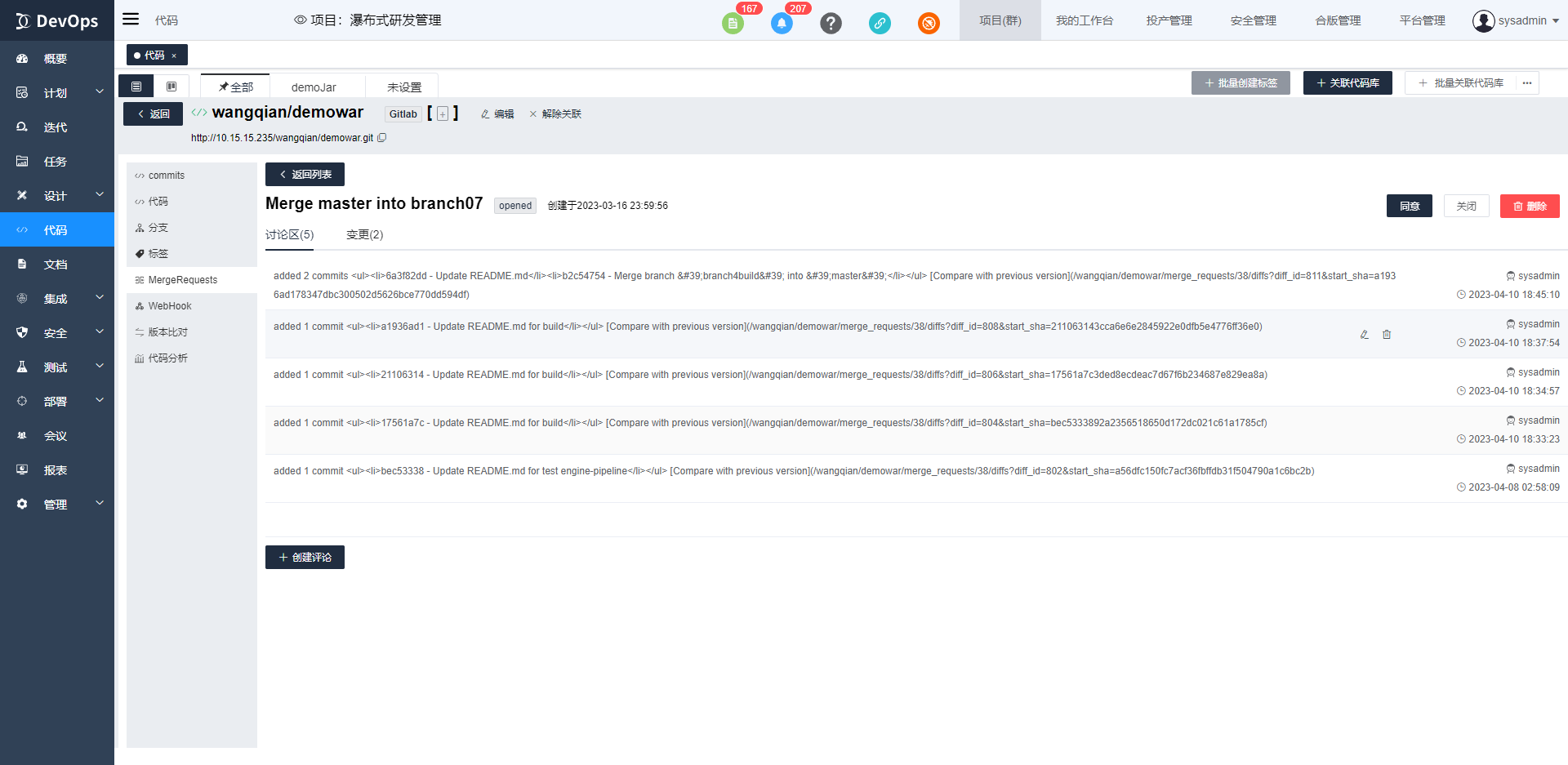 点击合并请求的查看按钮可以浏览合并请求的评论以及详情信息。