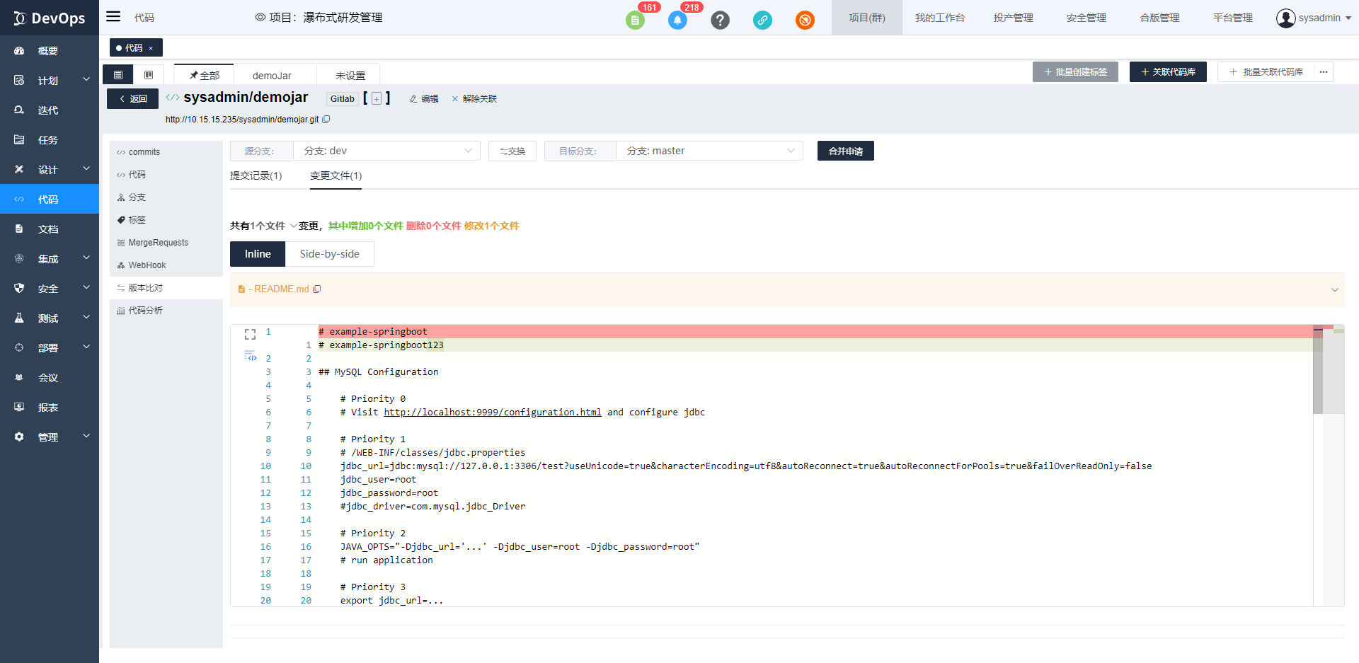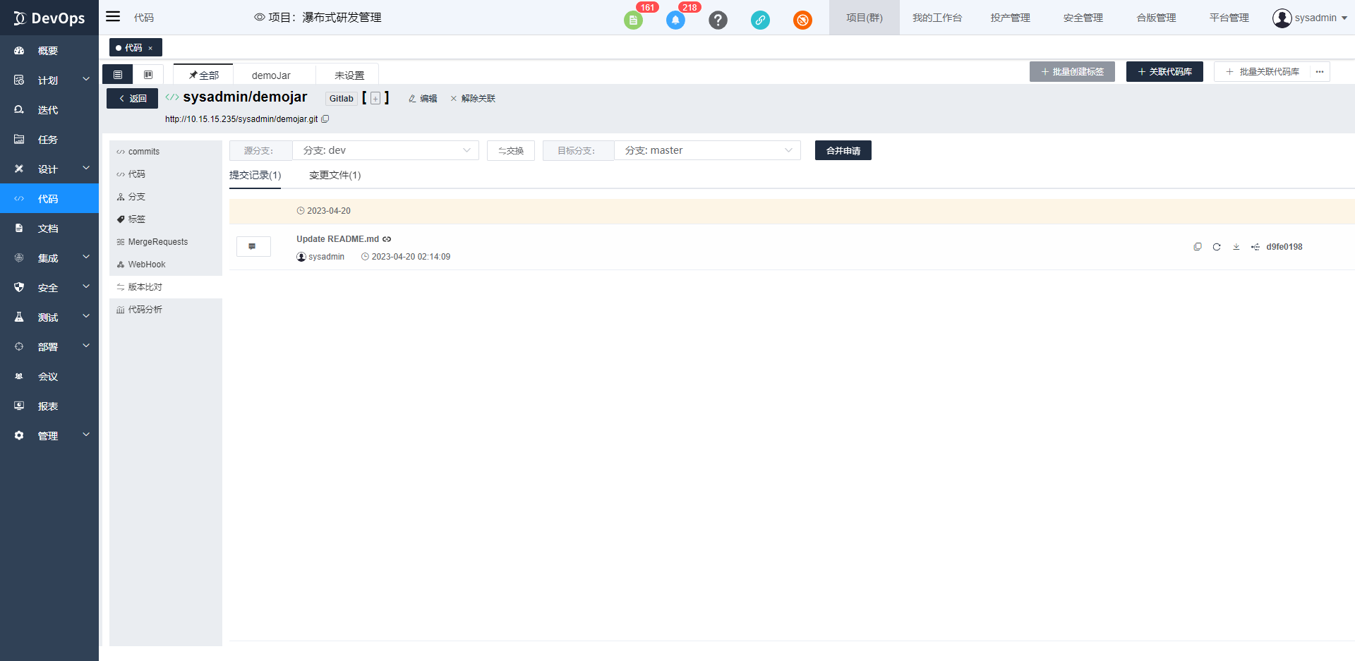 版本对比菜单提供了不同分支之间差异对比能力,分别以提交记录和变更文件两个角度来看分支之间的差异。