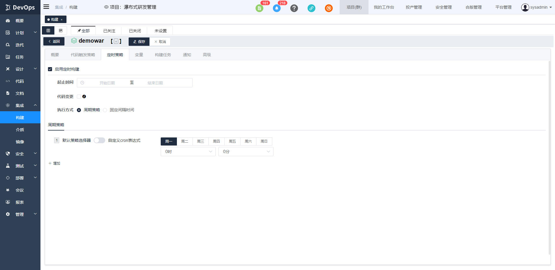 eg. 一般情况下,可以定期执行代码质量扫描,来保证代码健康度,如一周一次,建议在构建流水线中配置sonar质量扫描任务来执行代码质量扫描,并设定定时策略,示例流水线配置如下。