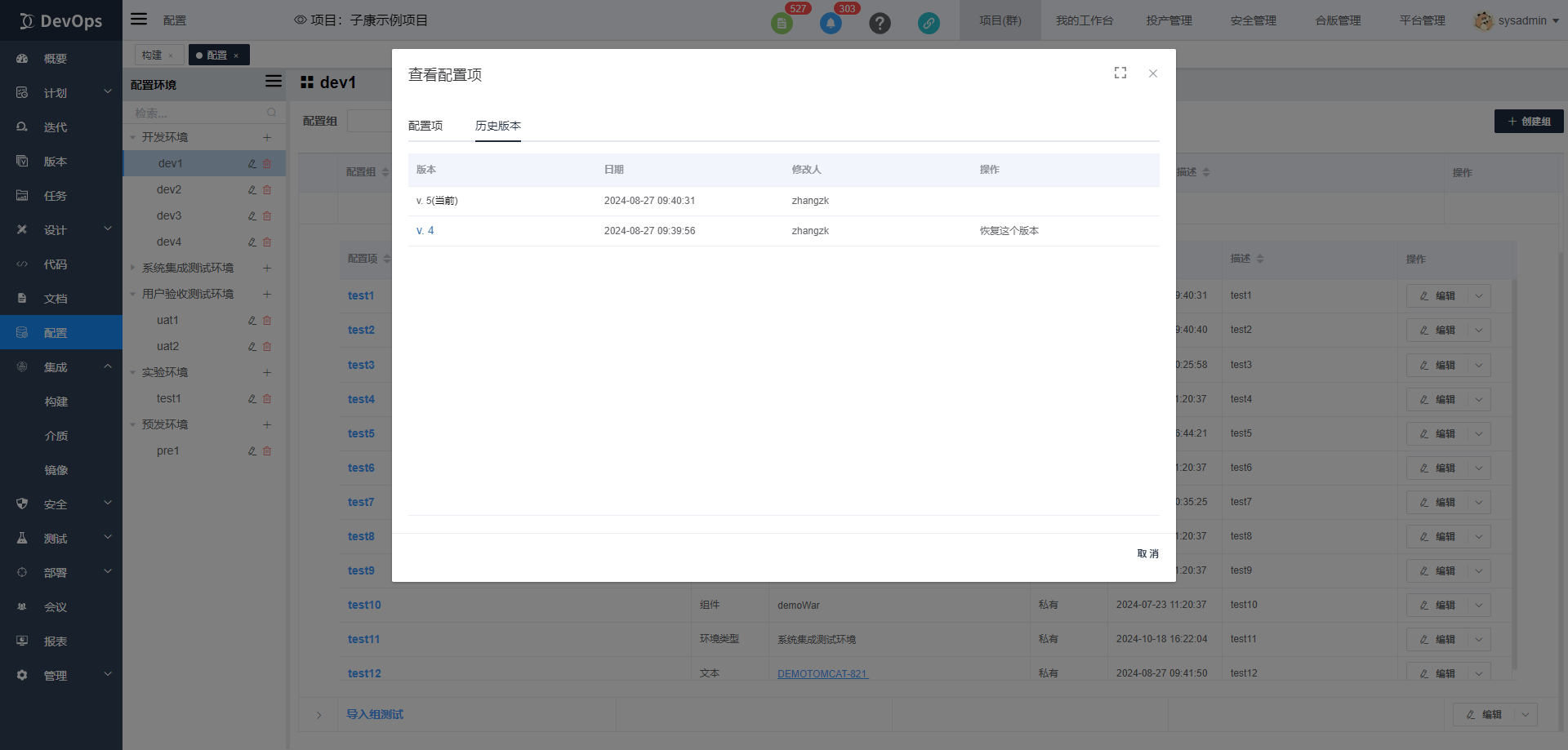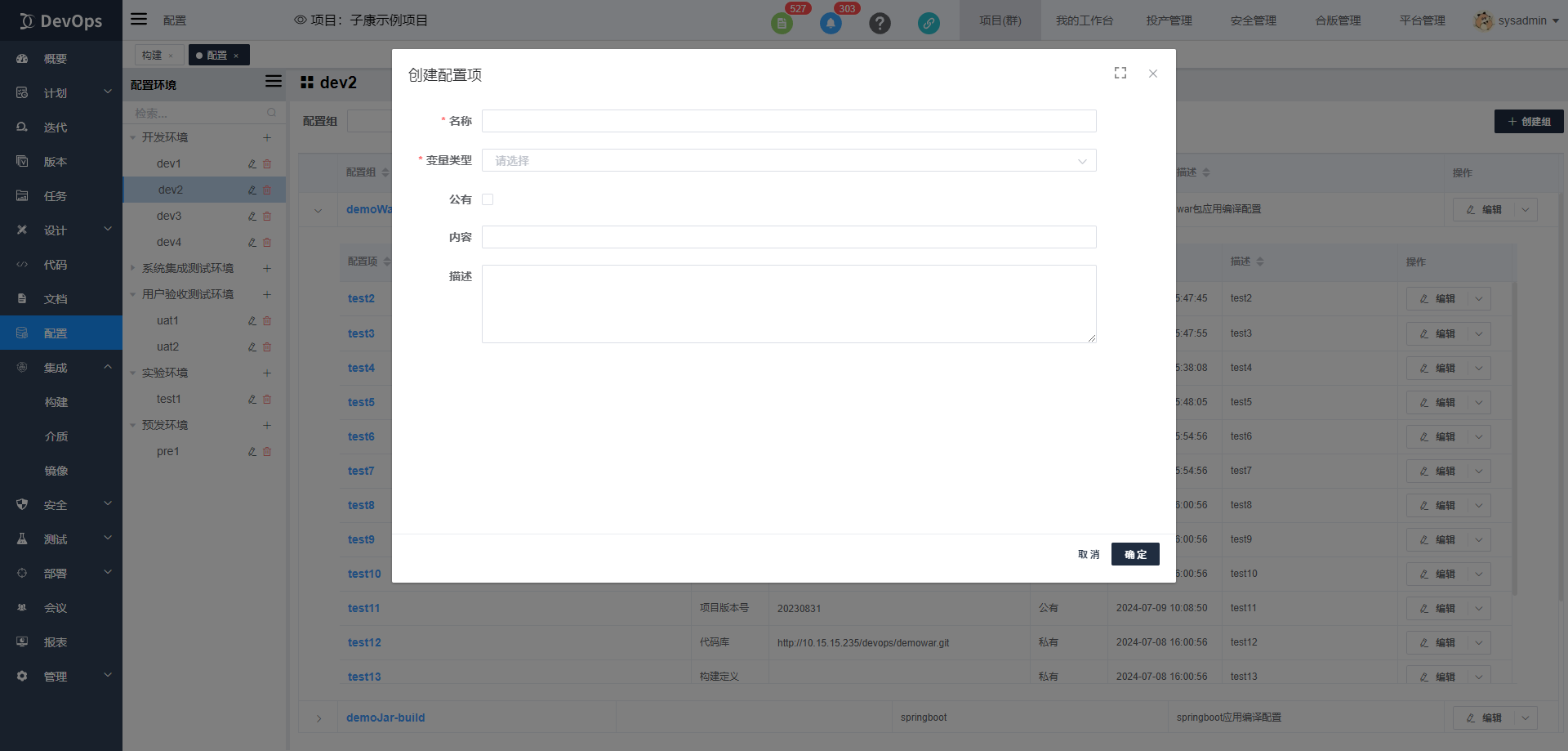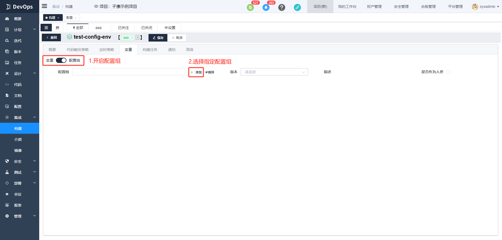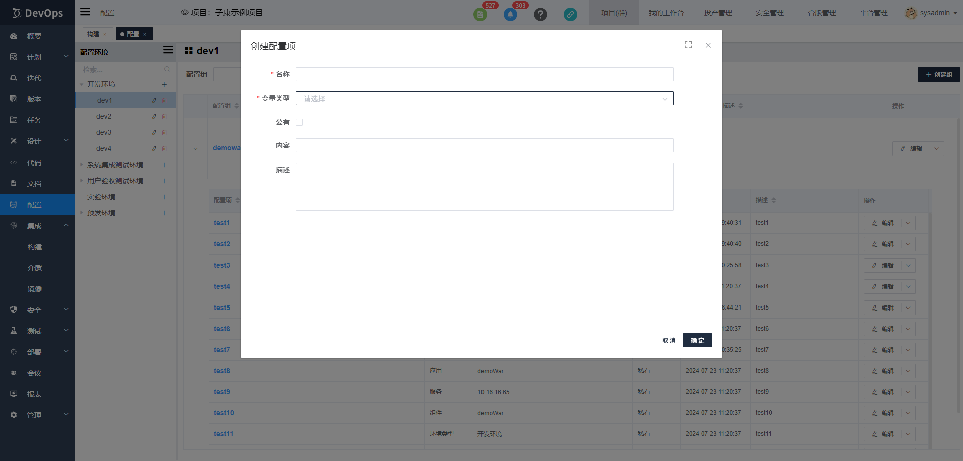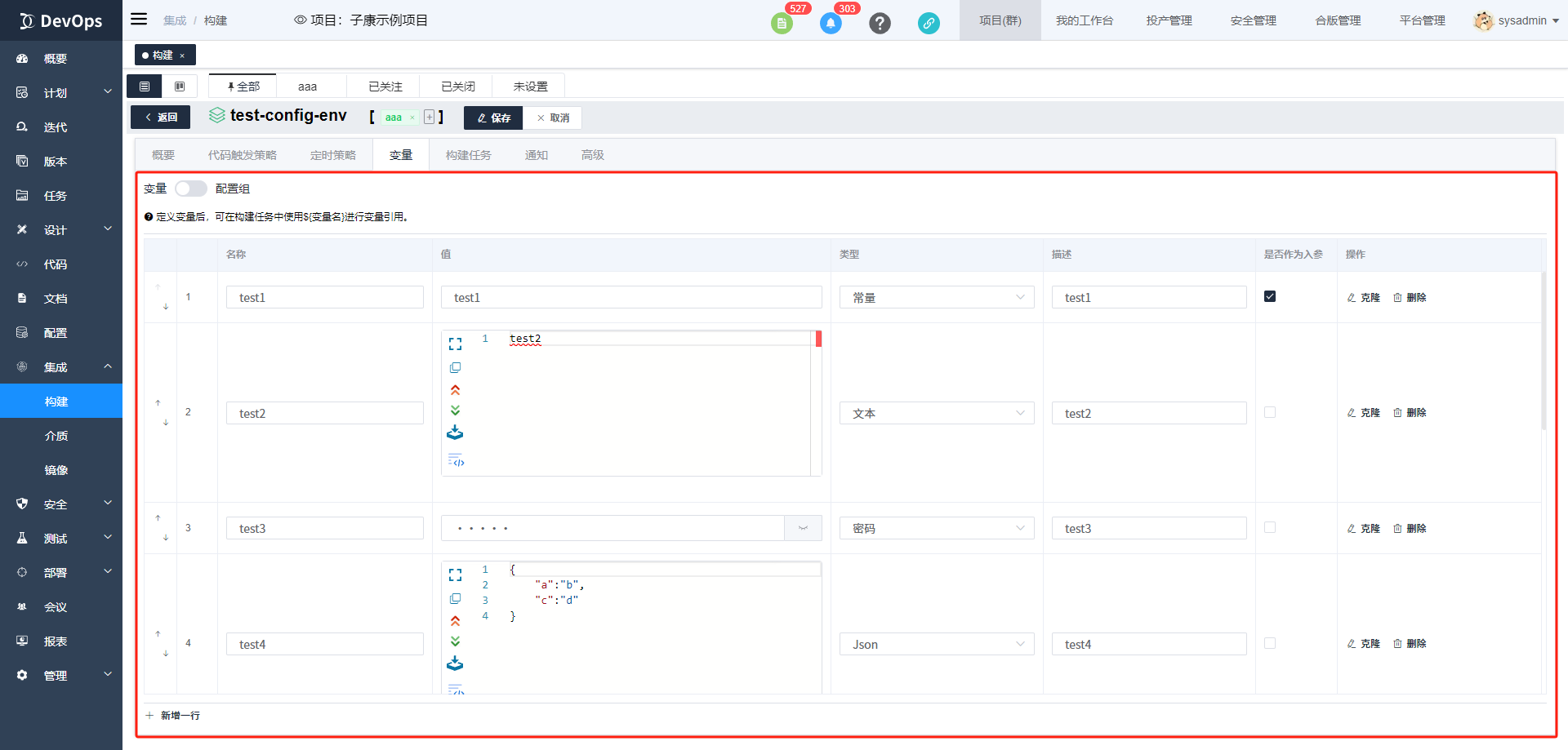 说明:配置管理中管理的配置组、配置项应用于构建、部署环节,便于用户统一管理流水线的变量配置。