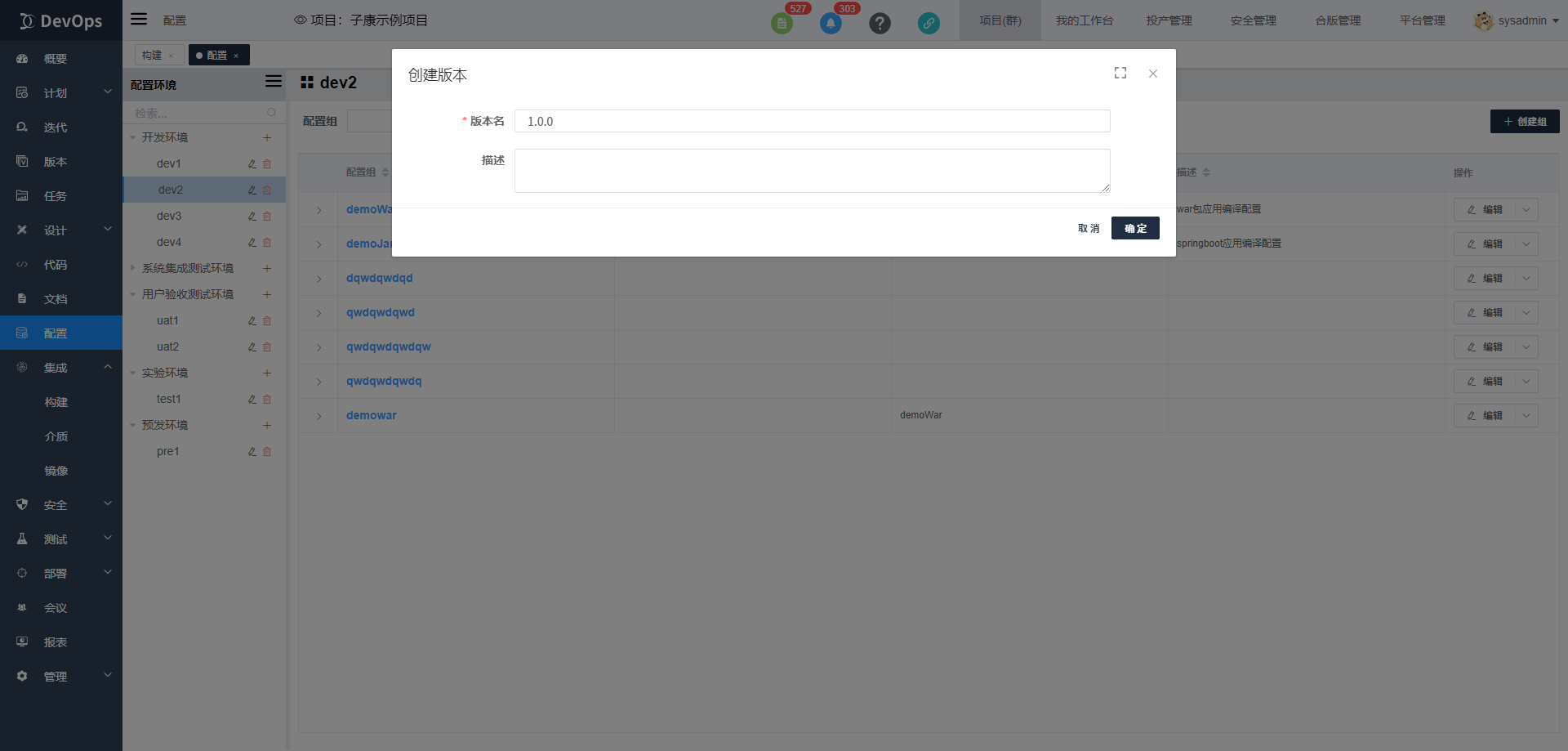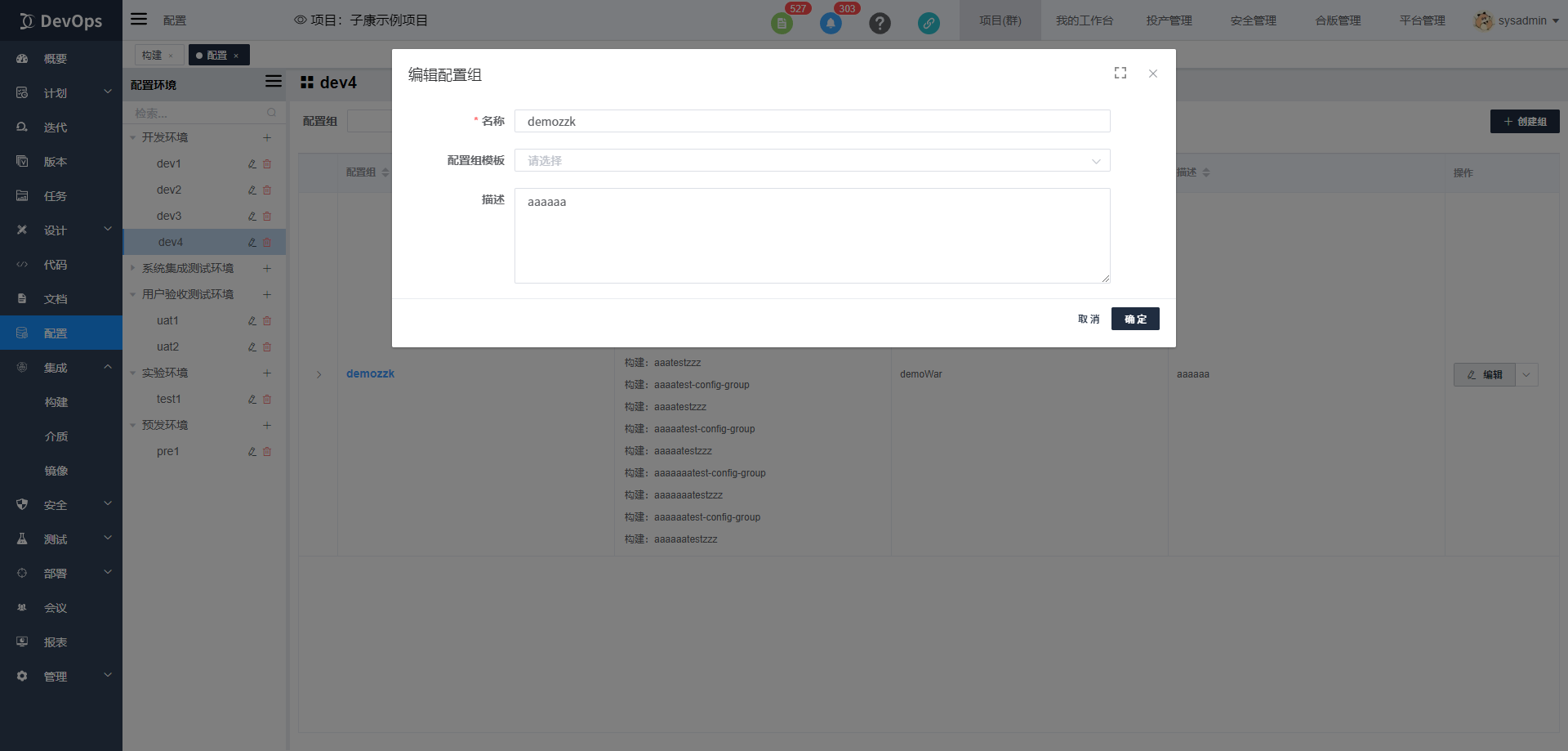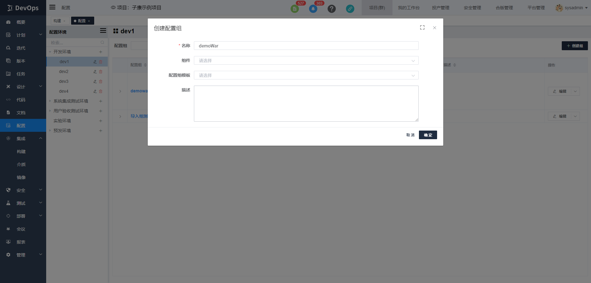 配置组为配置项的分组的概念,如,可以在开发环境的dev1集群下创建一个demoWar配置组,用于统一管理开发环境下执行部署的所有demoWar应用的流水线的变量。