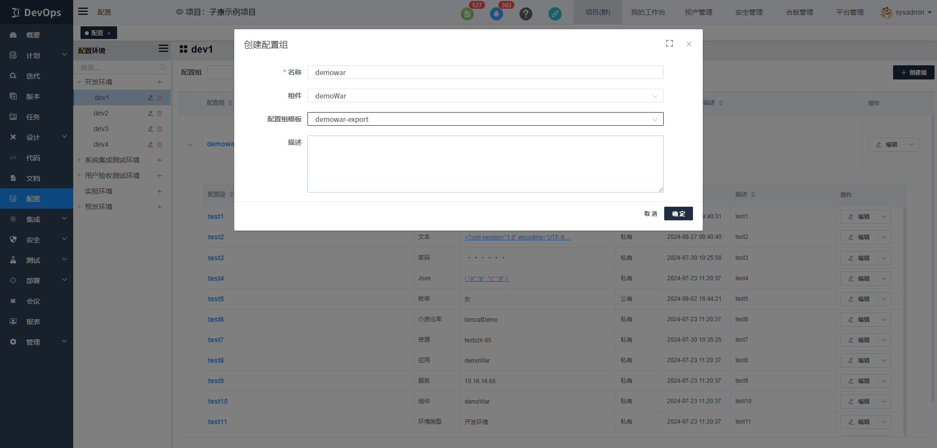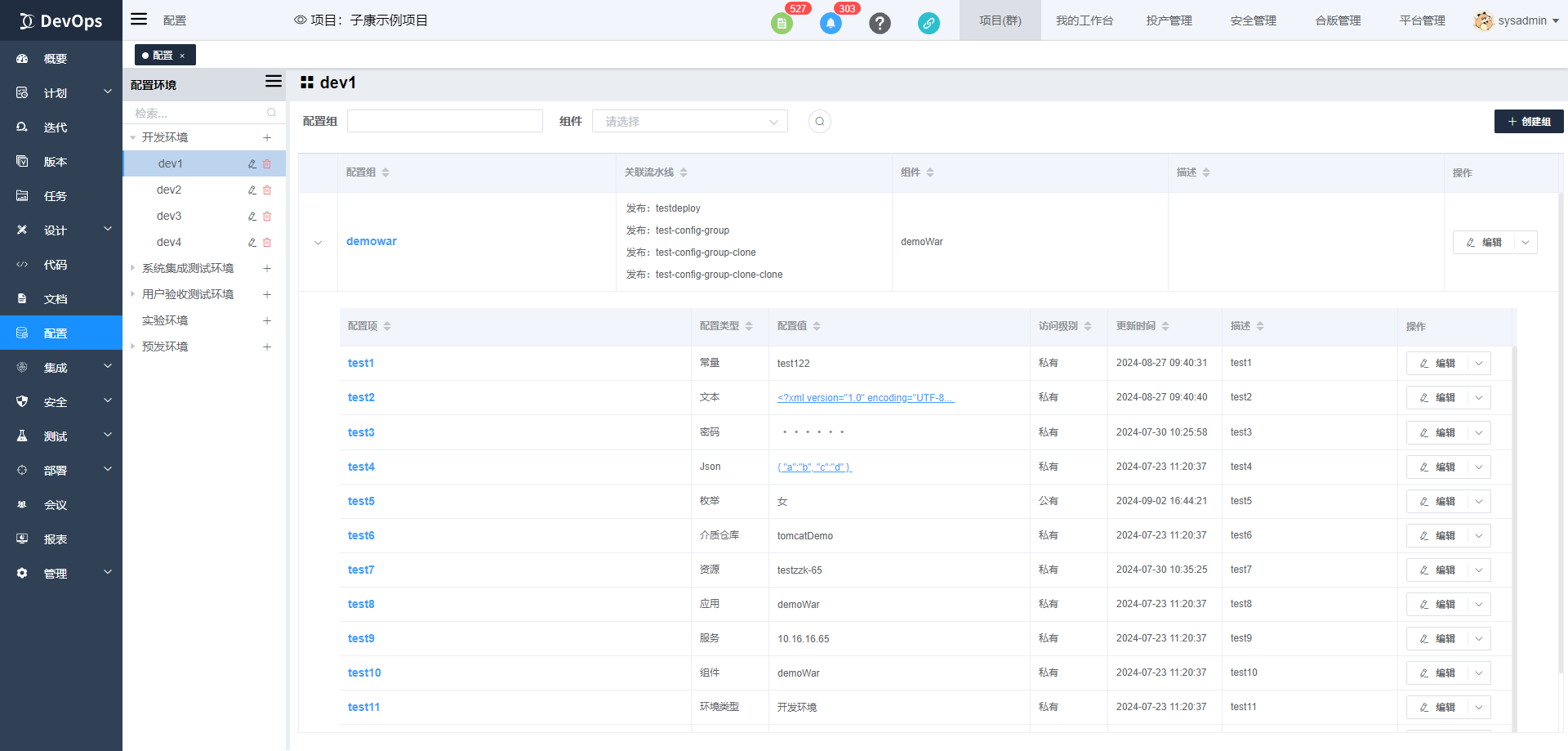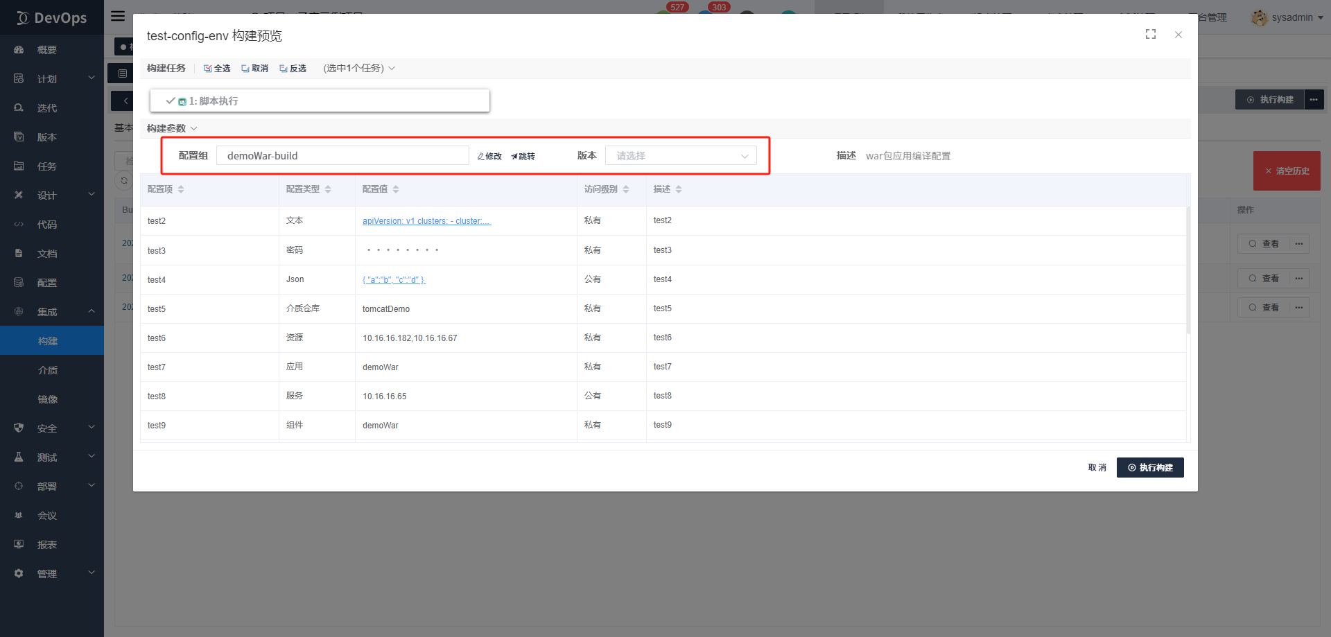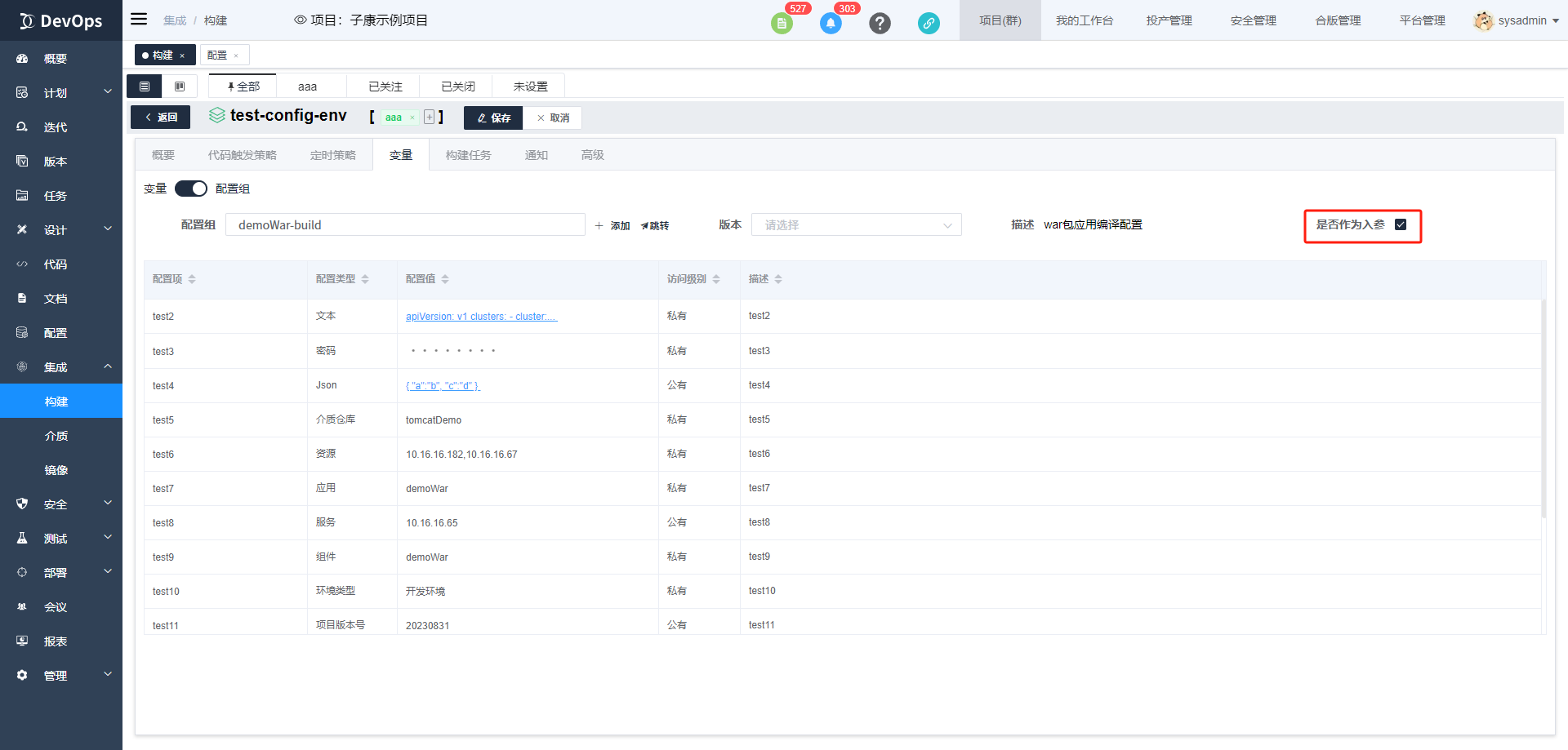 4.创建好了demoWar配置组、配置项后,在demoWar相关的构建、发布流水线即可使用对应环境的配置组执行构建、发布。