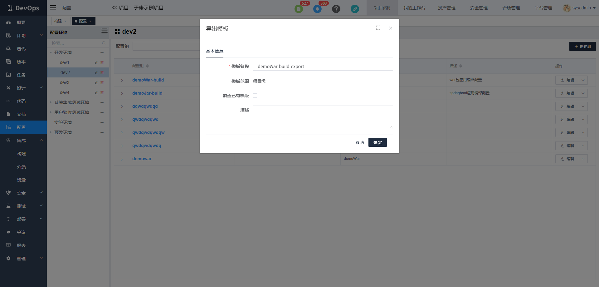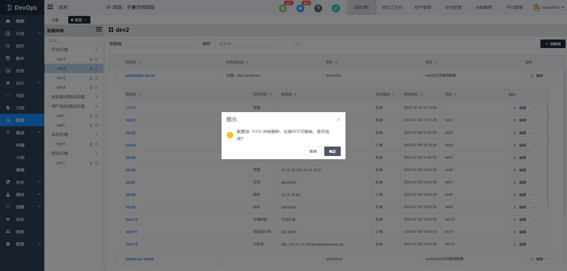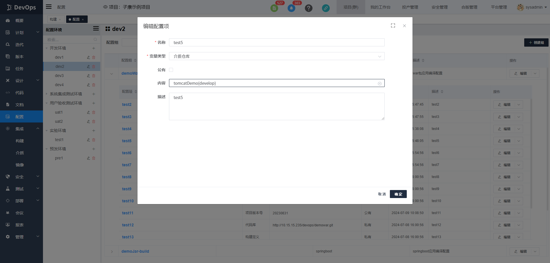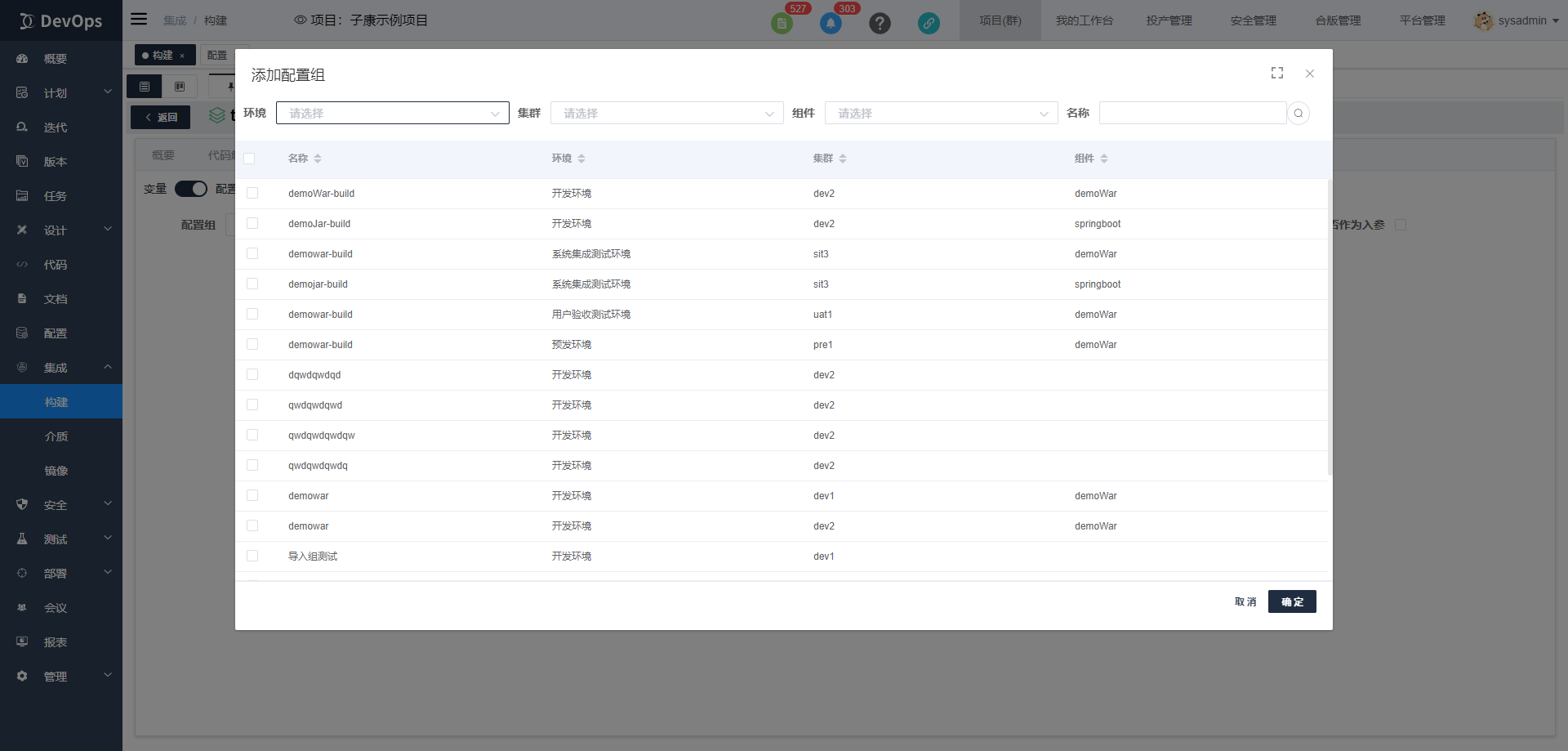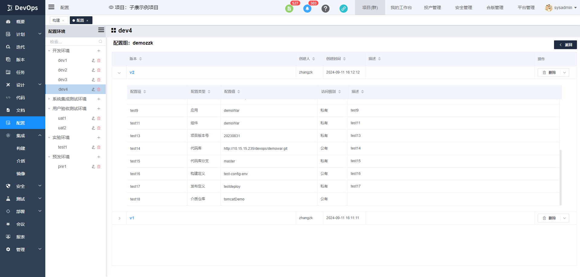 4.创建好了demoWar配置组、配置项后,在demoWar相关的构建、发布流水线即可使用对应环境的配置组执行构建、发布。