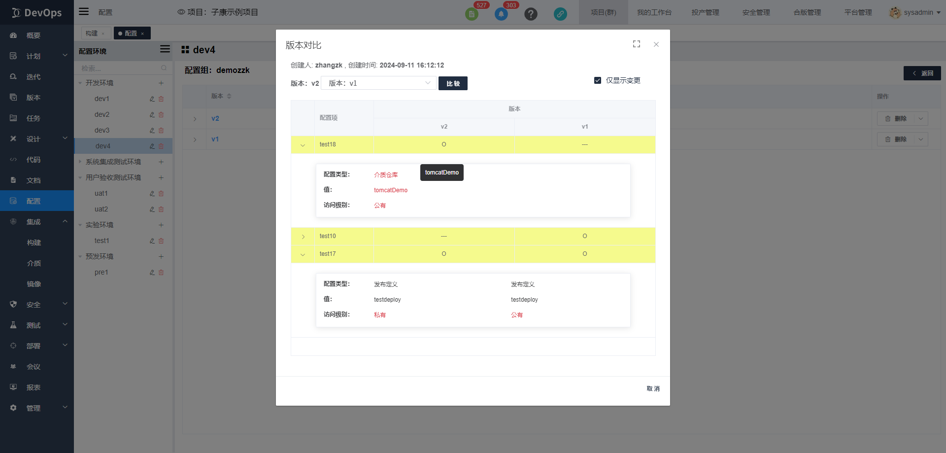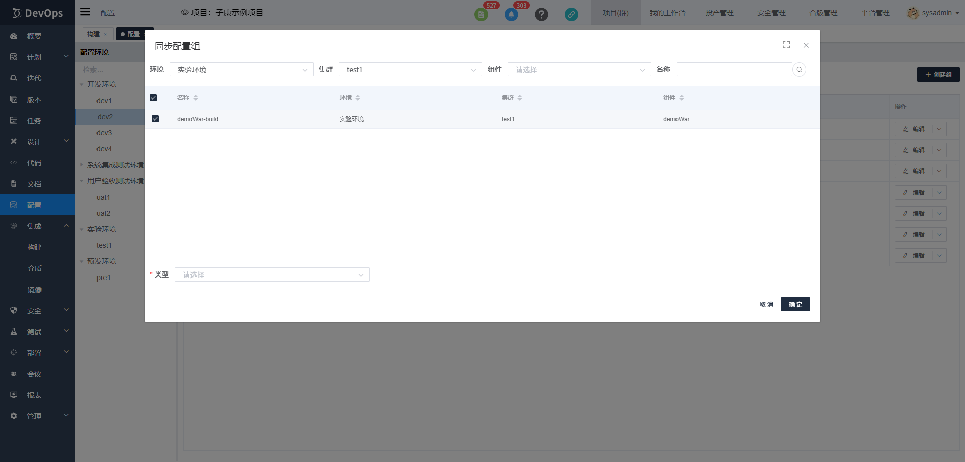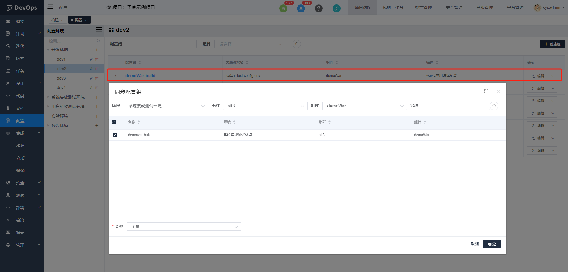 7.当配置组的配置项产生变更时,可以使用配置组同步能力同步变更至其他配置组,如便捷的将开发环境下的demoWar配置组的变更选择增量或全量的模式同步至测试环境下的demoWar配置组。