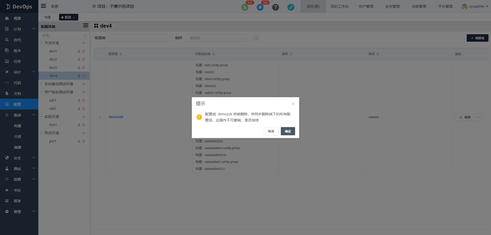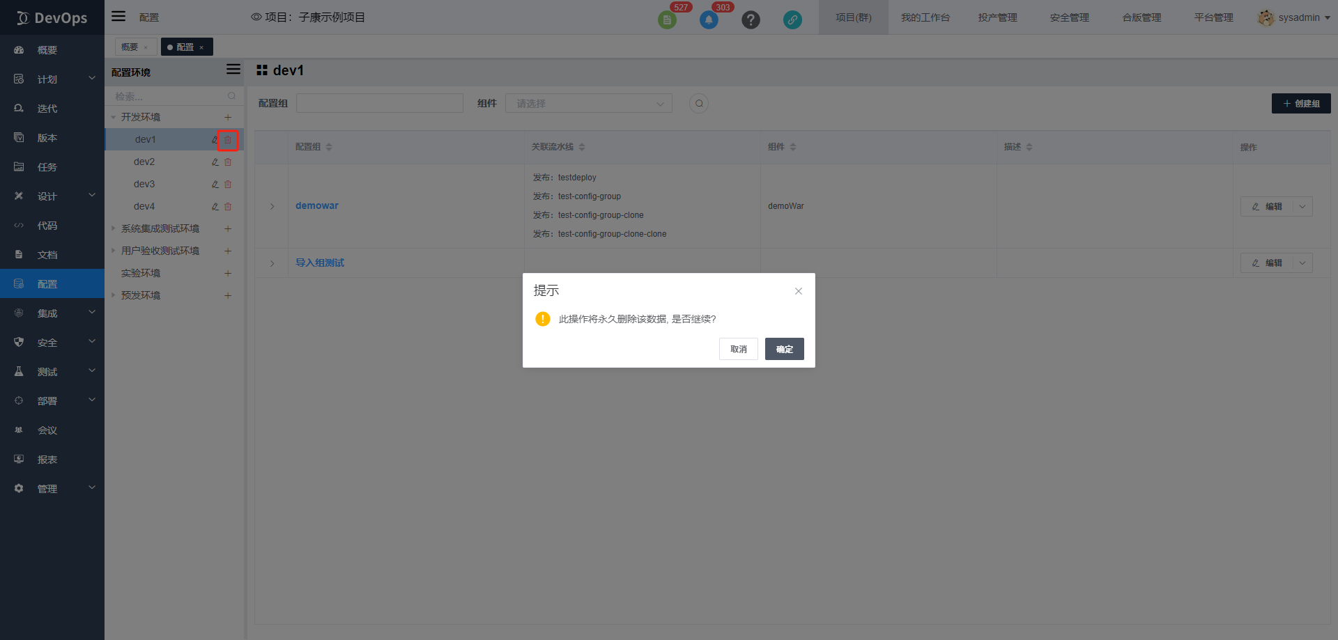 1.若配置组、配置组版本已被流水线引用,则不允许删除。