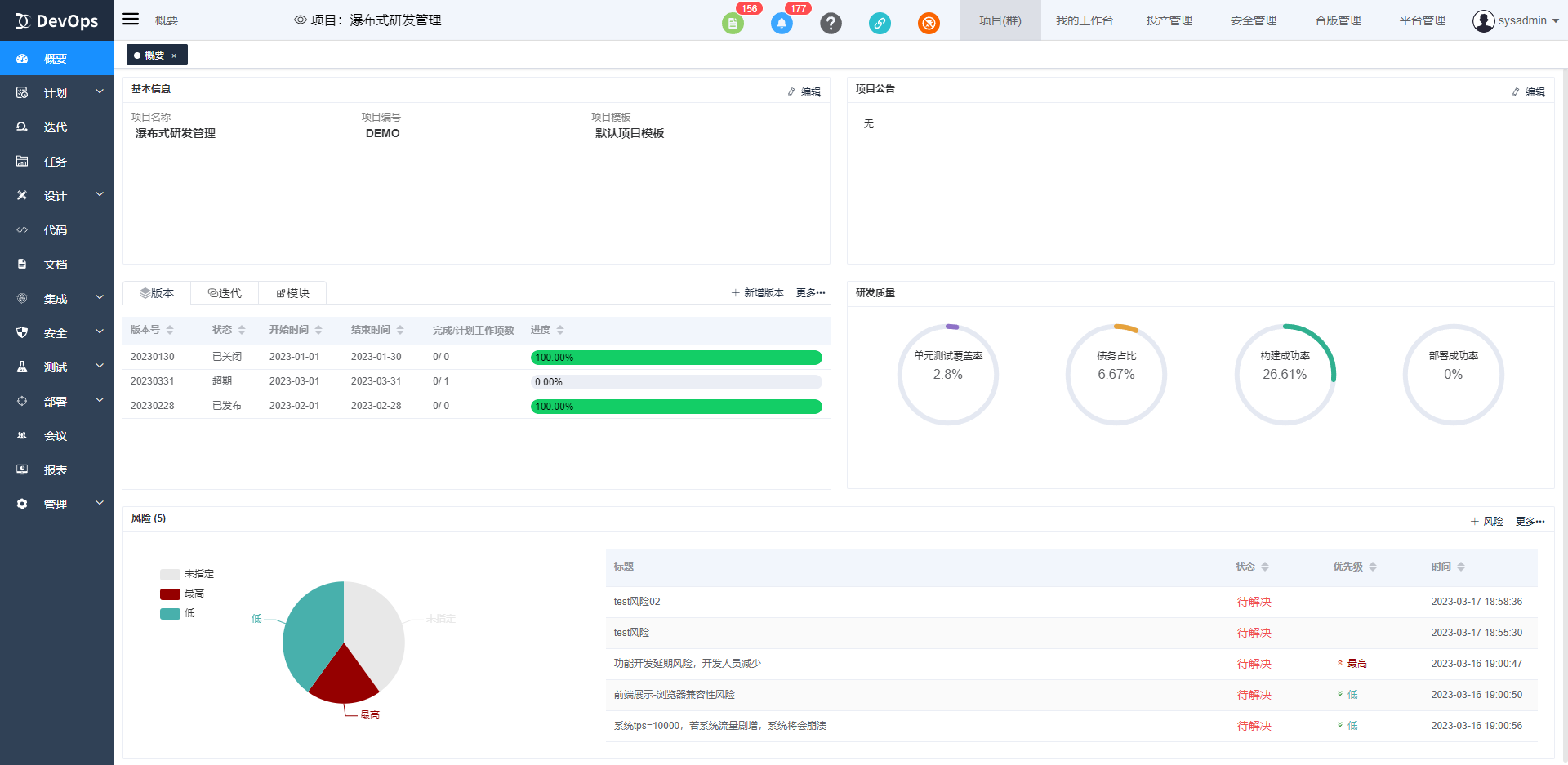 创建好了项目以后,点击项目进入项目概览页面,在该页面项目经理可以维护项目的基本信息,包括项目公告、版本、迭代、模块、风险,这些信息可以让项目成员对项目拥有一个简单直观的了解,首页的风险模块也可以让项目成员更清晰的了解到对当前项目进度产生影响的因素,及时处理风险。