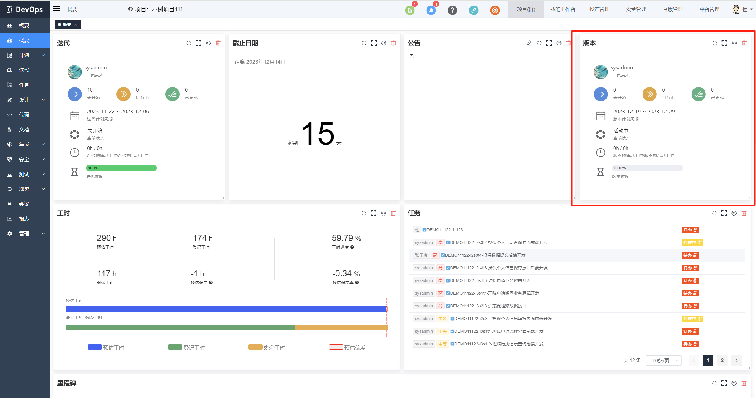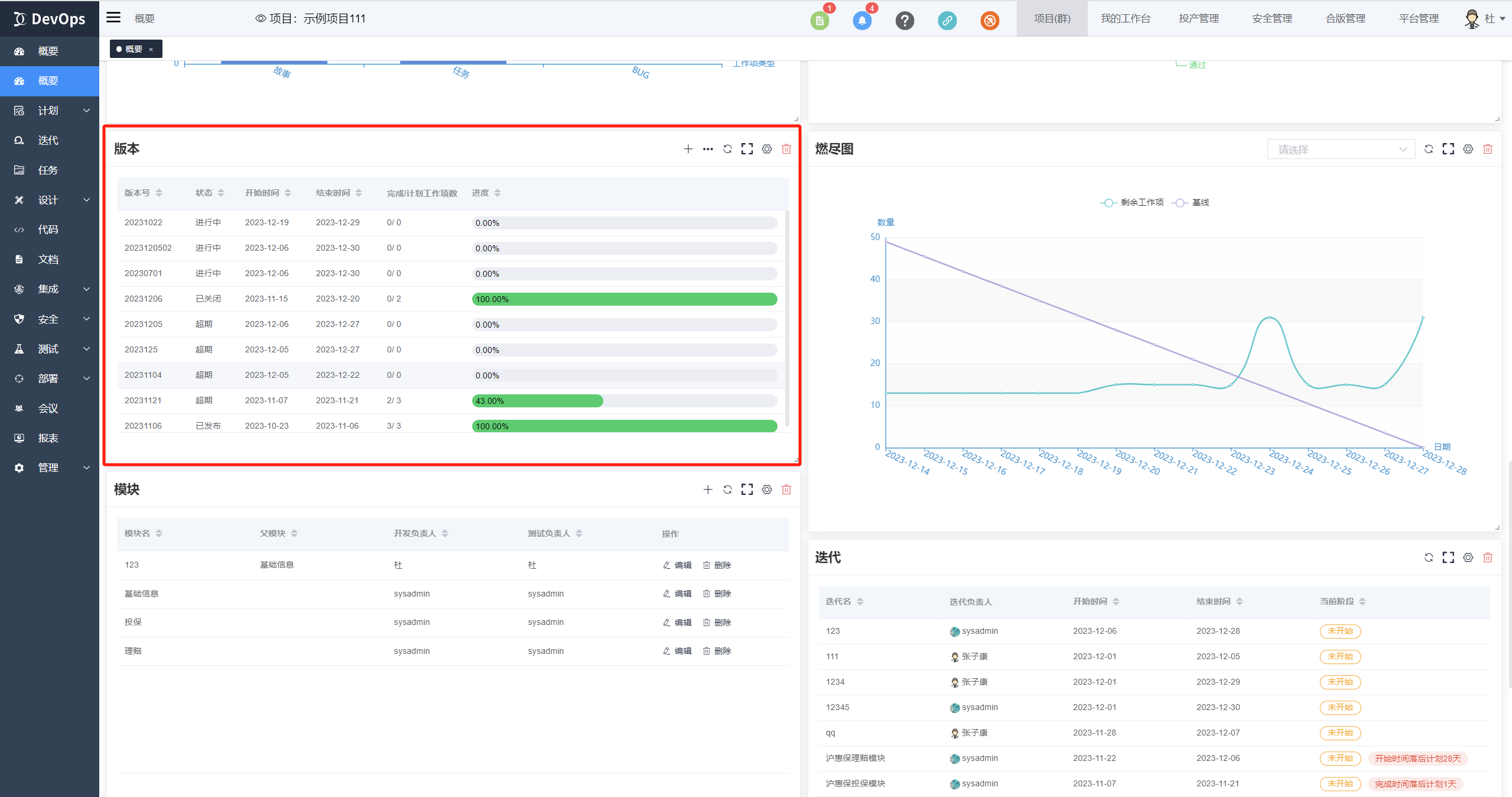 版本: 显示版本的关键数据,比如负责人、工作项进度和计划周期。