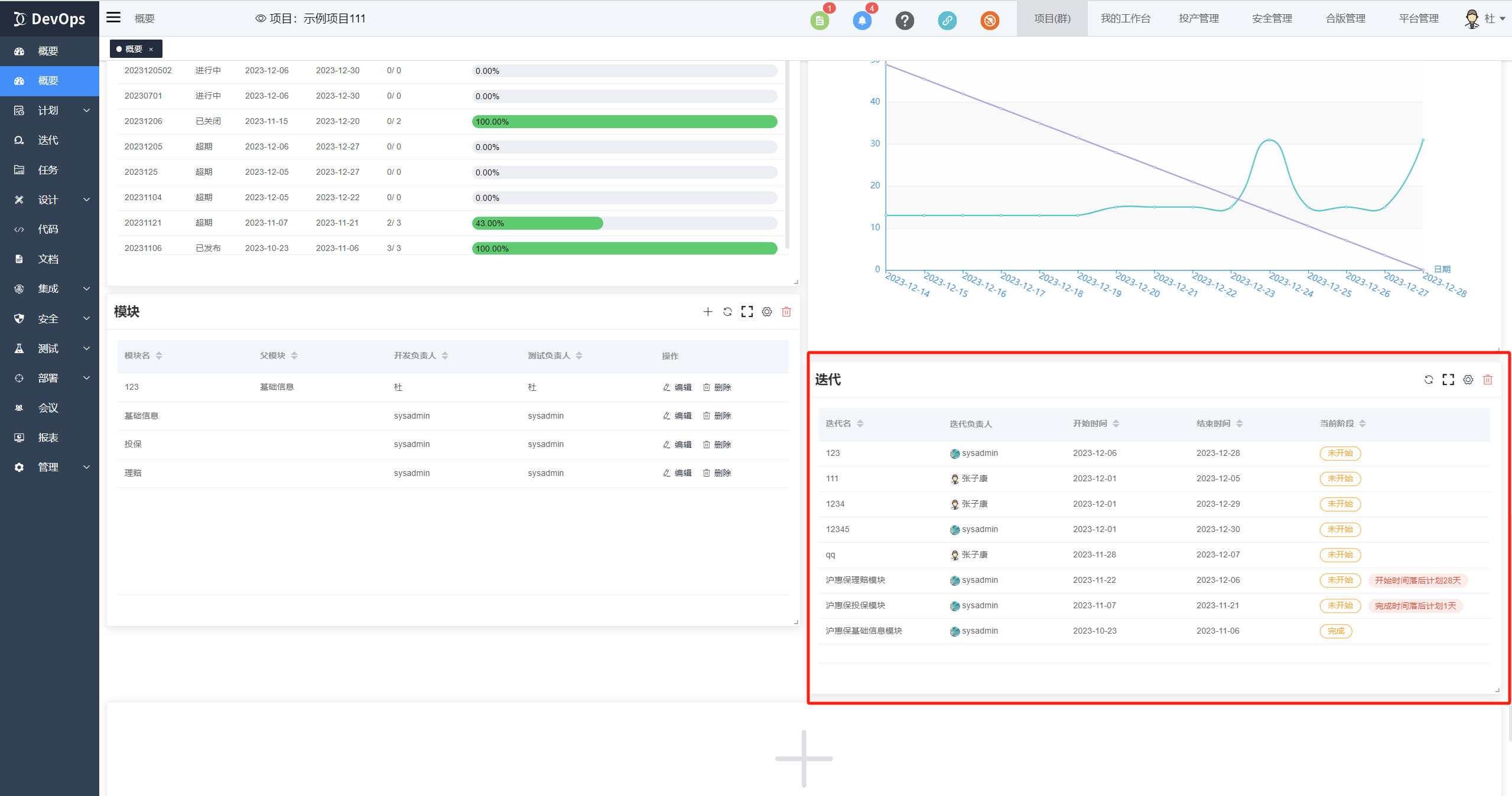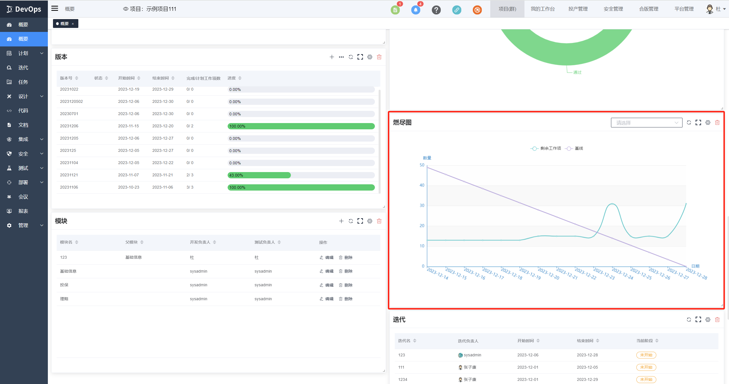 迭代: 显示迭代下的关键数据,比如负责人、工作项进度和计划周期。