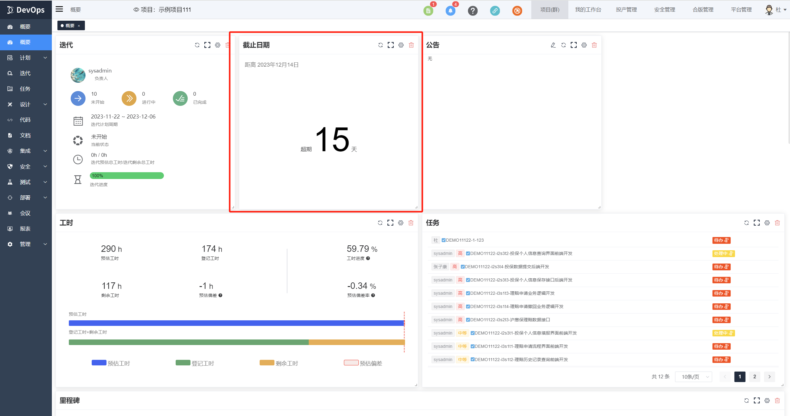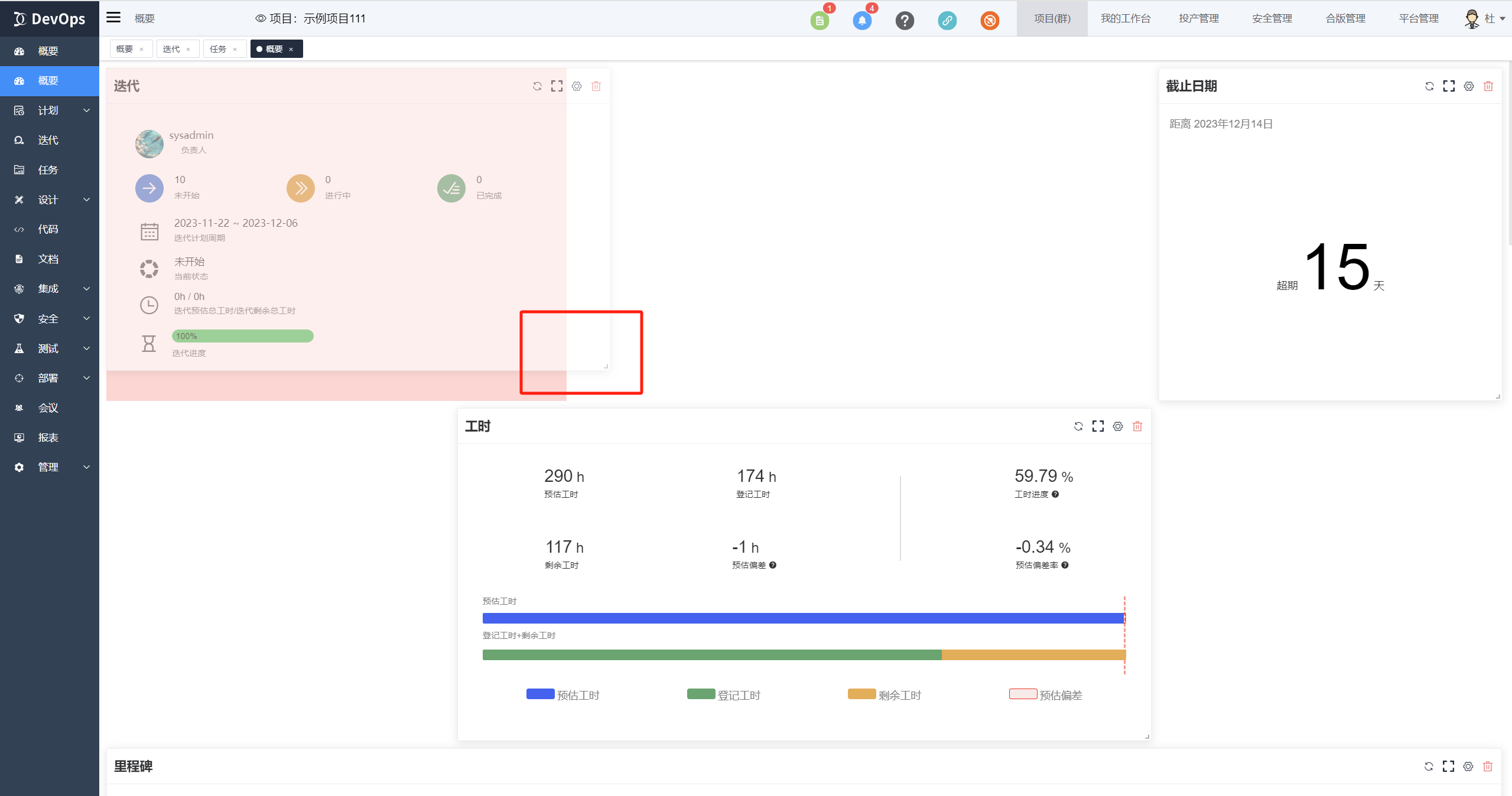工时: 可以显示项目下总预估工时、总登记工时、总剩余工时、工时进度以及进度偏差。