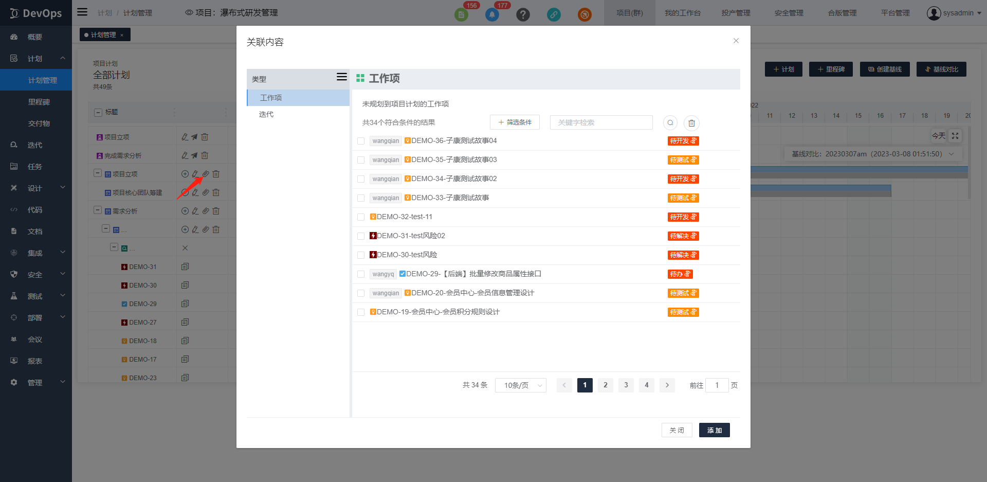 计划可以关联工作项以及迭代来对计划的实施进行跟进,关联迭代时,会将迭代下所有的工作项全部关联展示。