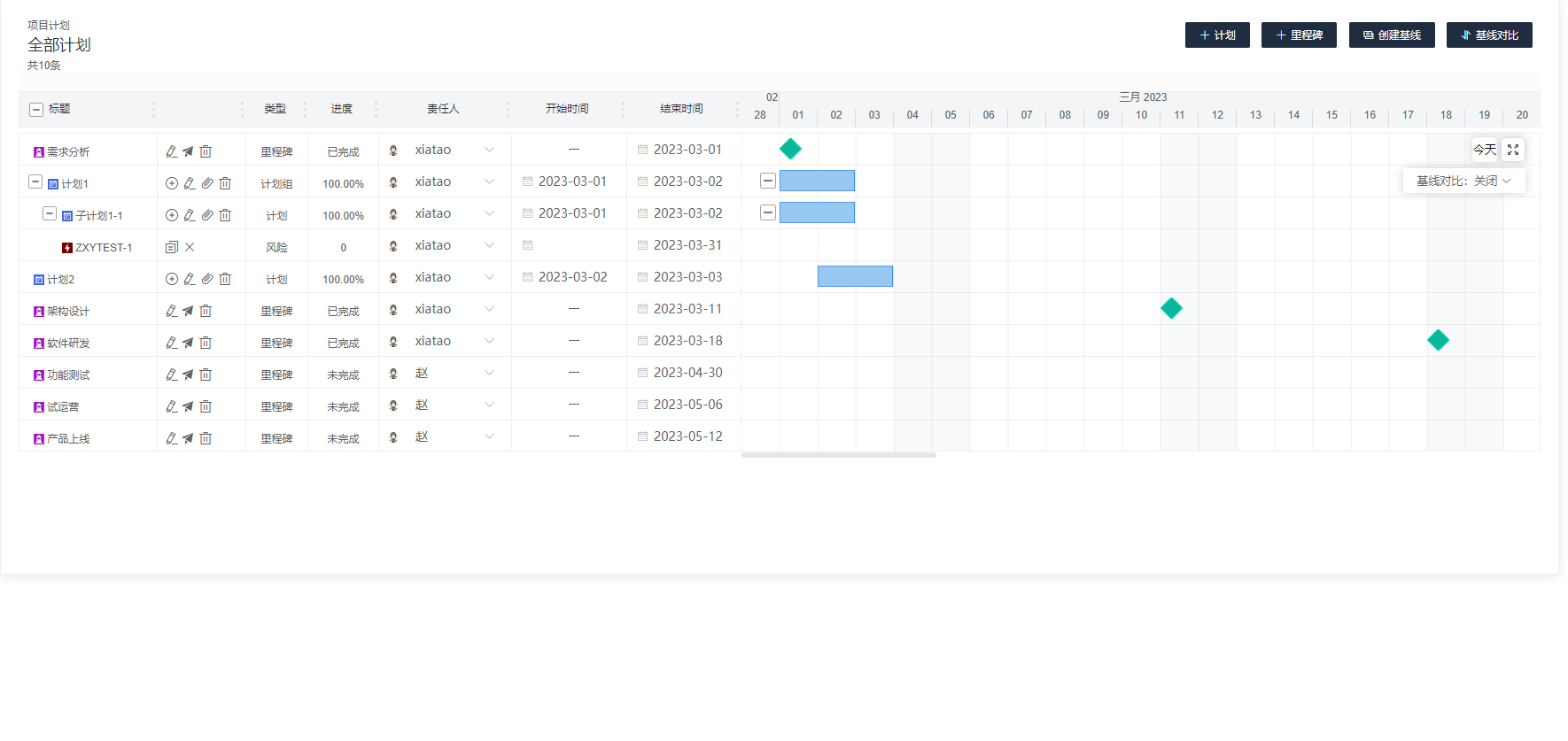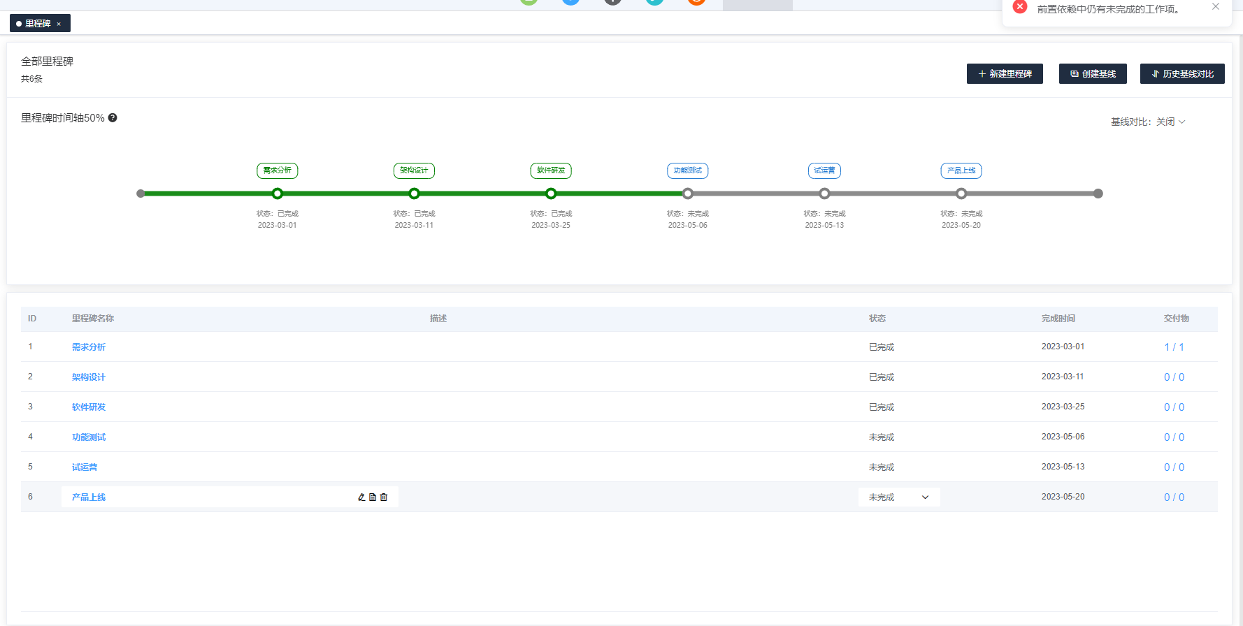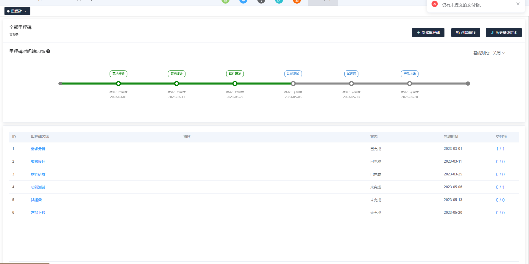 创建好的里程碑节点会同步展示在计划管理页面,方便把控整个项目的进度。