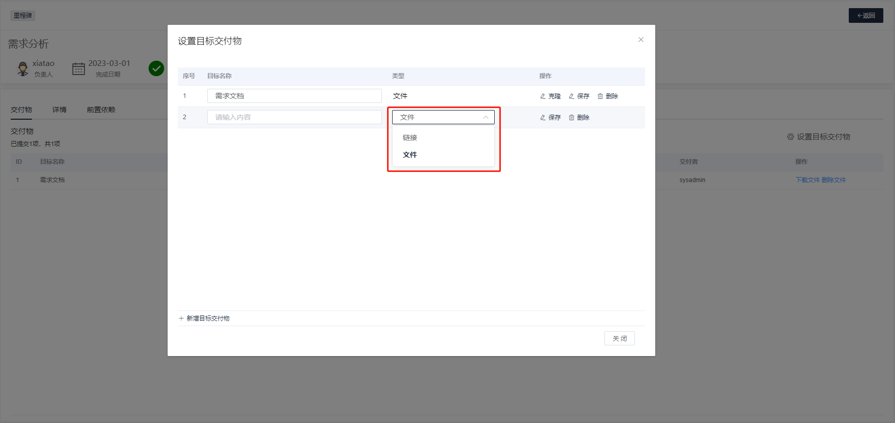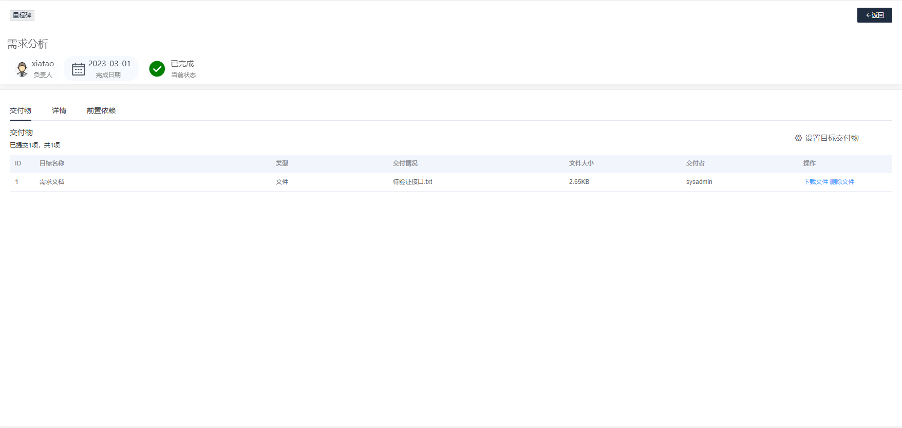 设定好了里程碑的节点后,项目负责人同时需要规划各个节点完成的条件,进入节点详情页面,可以设置节点的目标交付物,作为里程碑节点完成的凭证,交付物有链接和文件两个种类 。