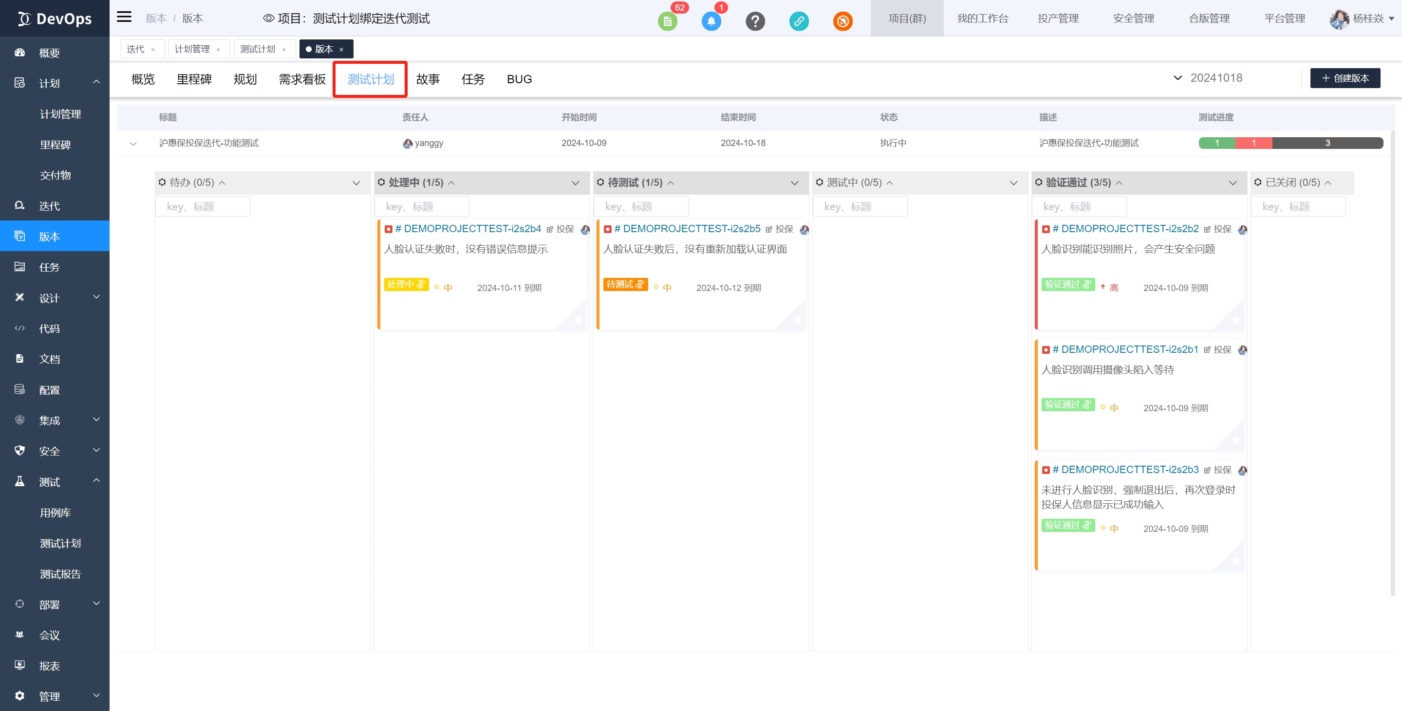 当测试计划创建时绑定了版本,即可在版本测试计划页面查看到对应测试计划,可以直观查看测试计划中测试用例的执行进度,展开测试计划,泳道中呈现了当前计划中关联的缺陷以及对应状态。