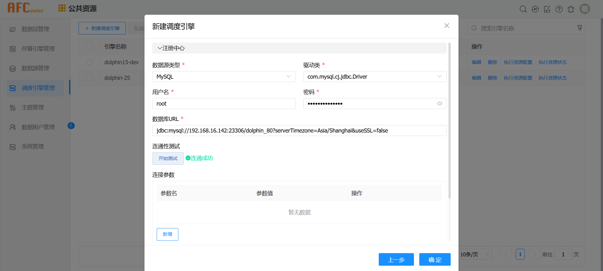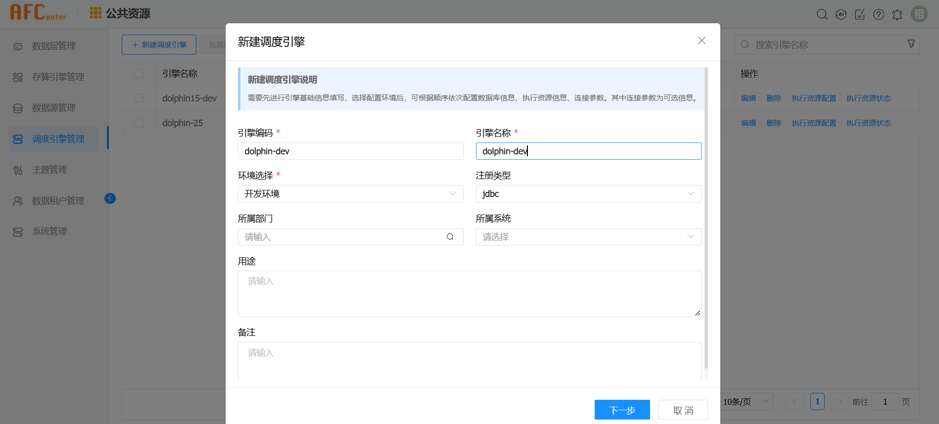 输入引擎名称、引擎编码、选择环境:开发环境,选择注册类型:jdbc,点击下一步。