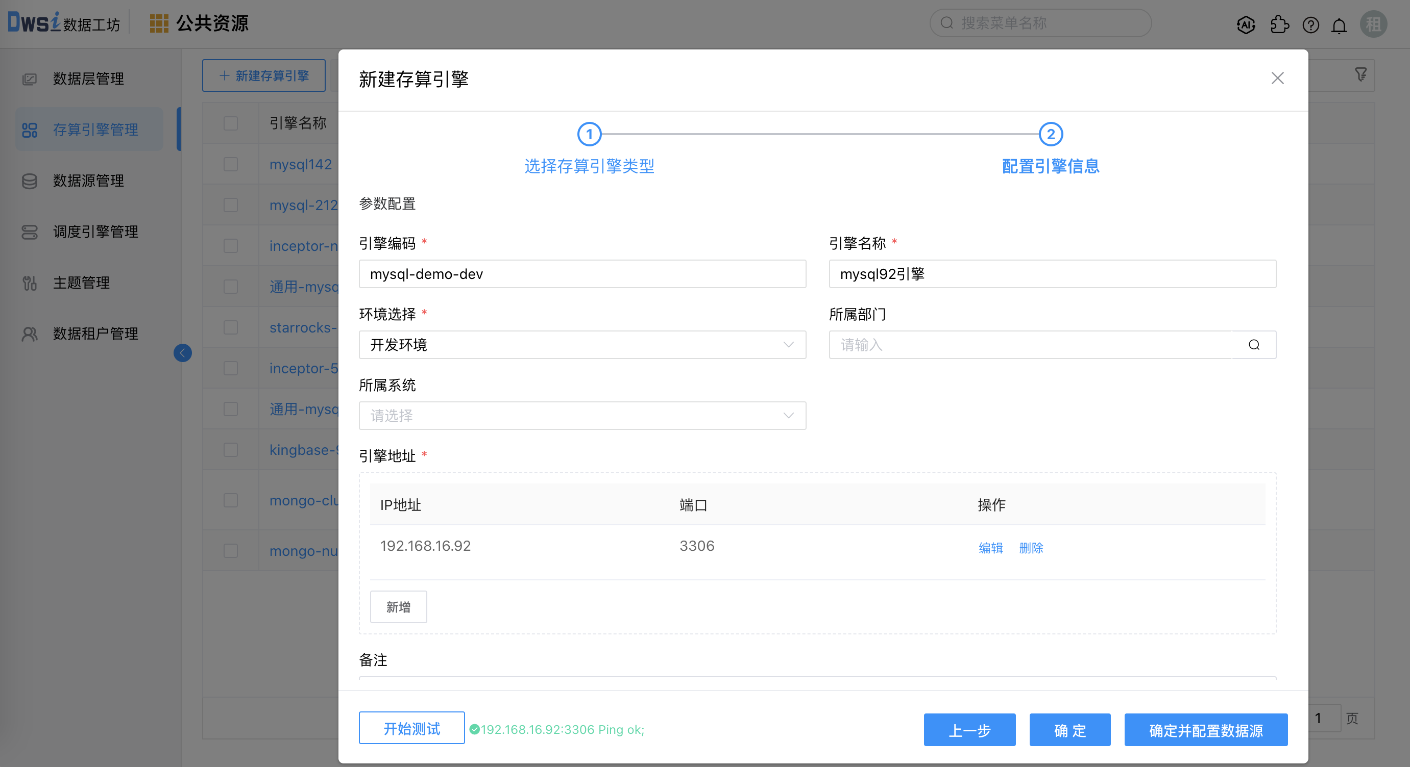 输入必填项:引擎编码、引擎名称、环境选择、引擎地址及引擎端口,点击开始测试按钮,测试成功后点击确定按钮保存引擎数据。