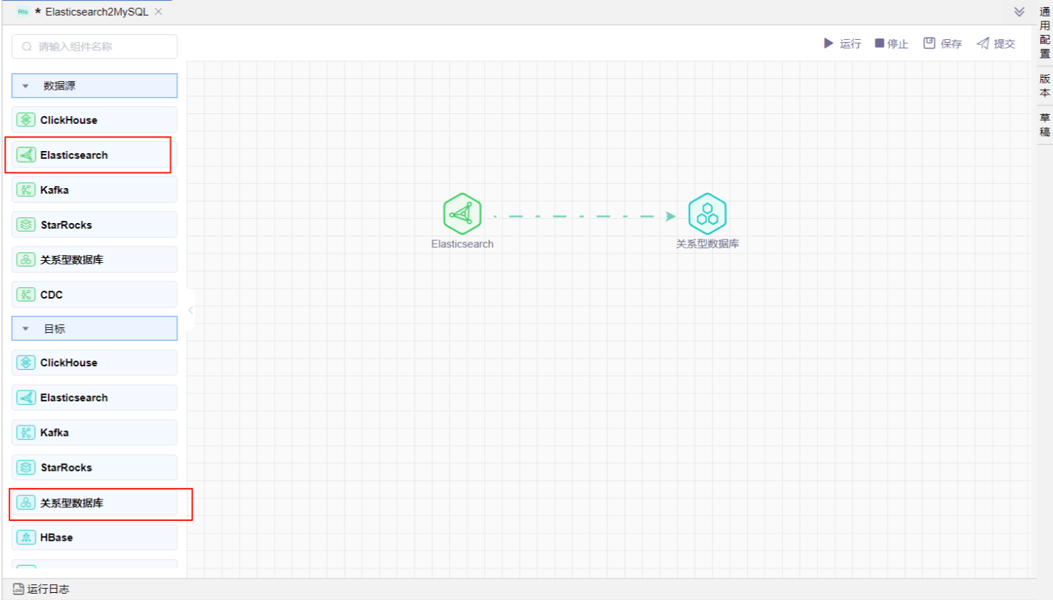 在画布中分别拖拽 1 个"Elasticsearch数据源"图元、1 个"关系型数据库目标"图元,并建立连线。
