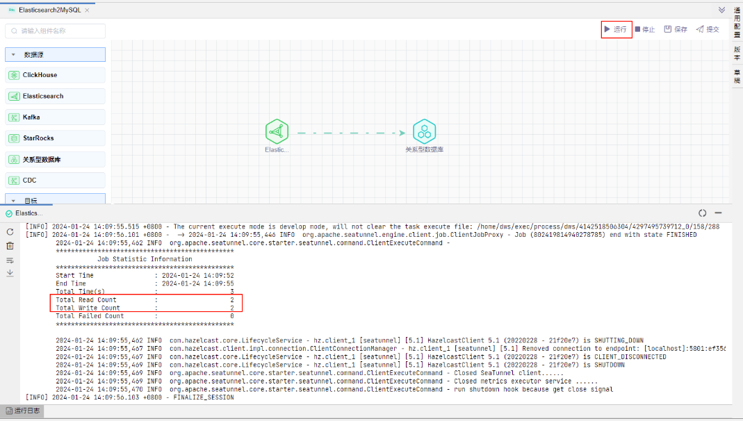 点击【运行】按钮,可以运行已经开发完毕的场景,在日志栏可以看运行日志及运行结果。