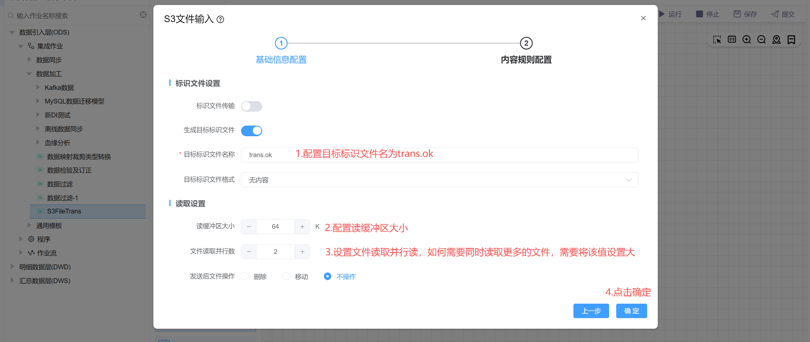 配置目标标识文件为trans.ok(传输完成后会在目录目录下生成一个trans.ok文件),配置读取缓冲区大小和读取并行度。然后点击确定。