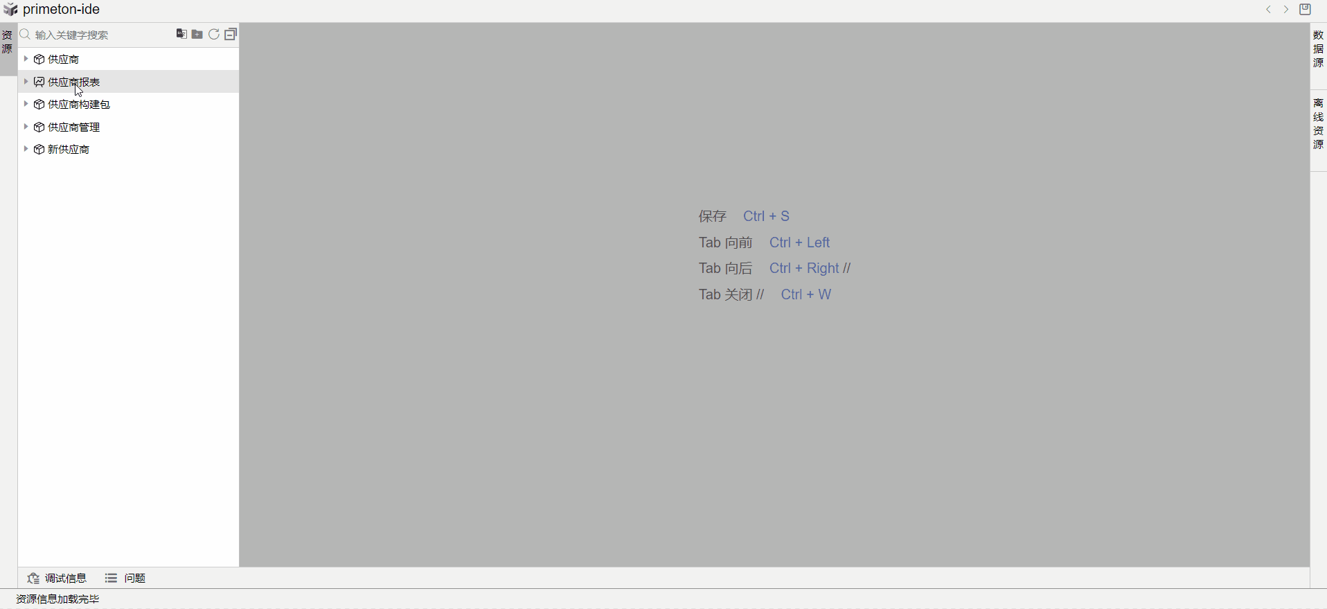 在开发中心页面,点击开发,进入低开开发页面,点击资源部分的新建图标,新建报表构件包。 输入构件包的代码与名称,开启是否报表构件包选项,点击创建。