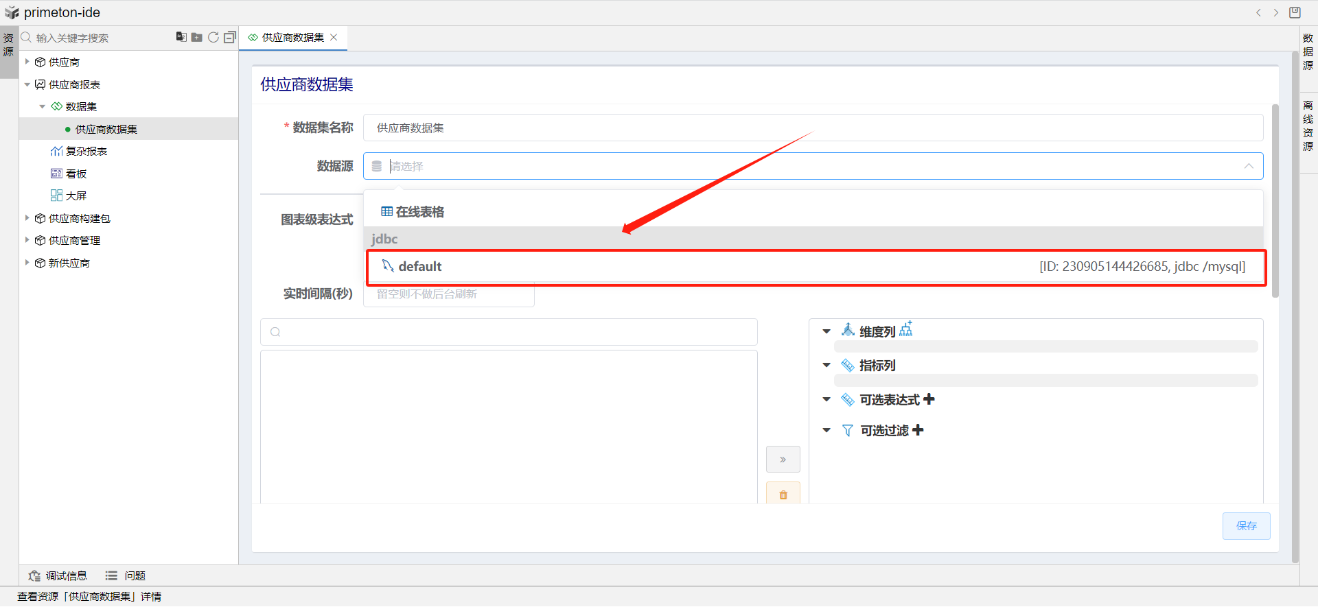 在供应商数据集页面中,点击数据源,选择供应商表所在数据源。