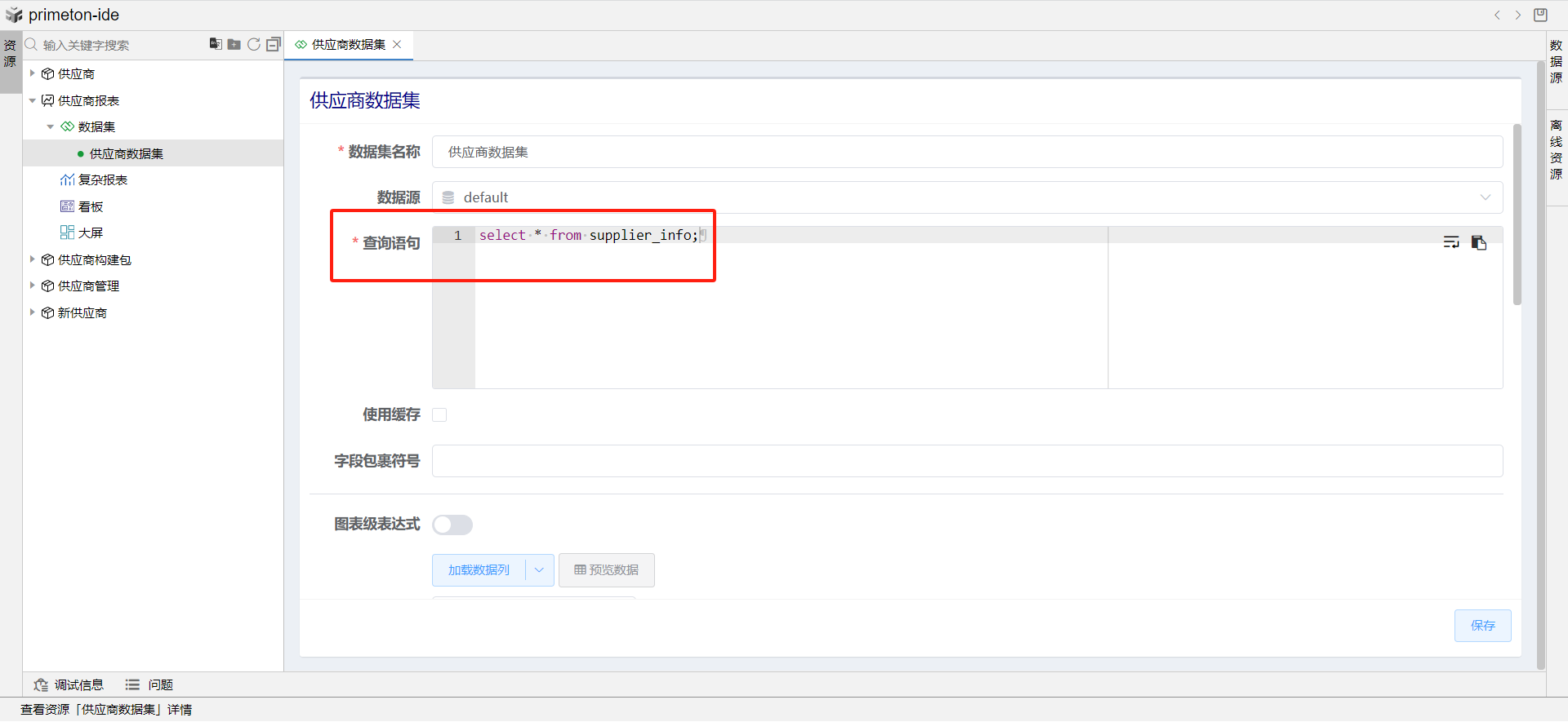 打开供应商报表构件包,新建数据集。
