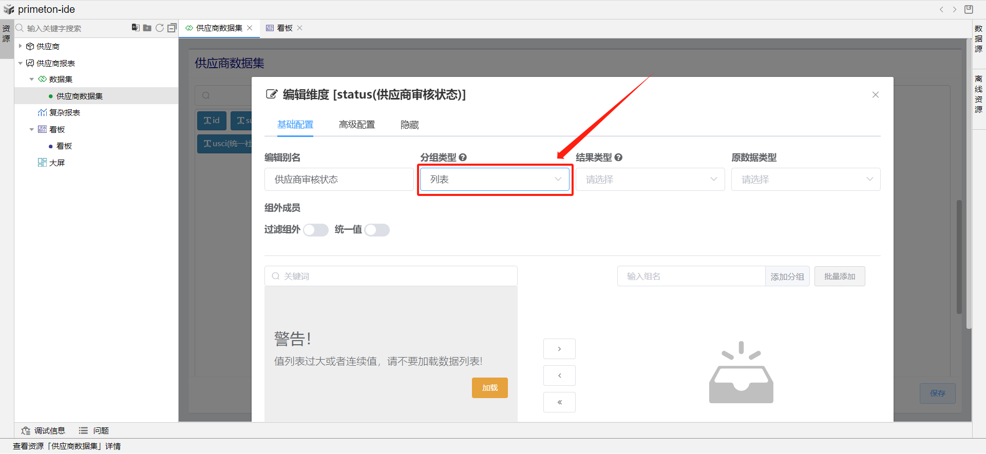 添加维度列和指标列,并修改指标列id别名为供应商数量。