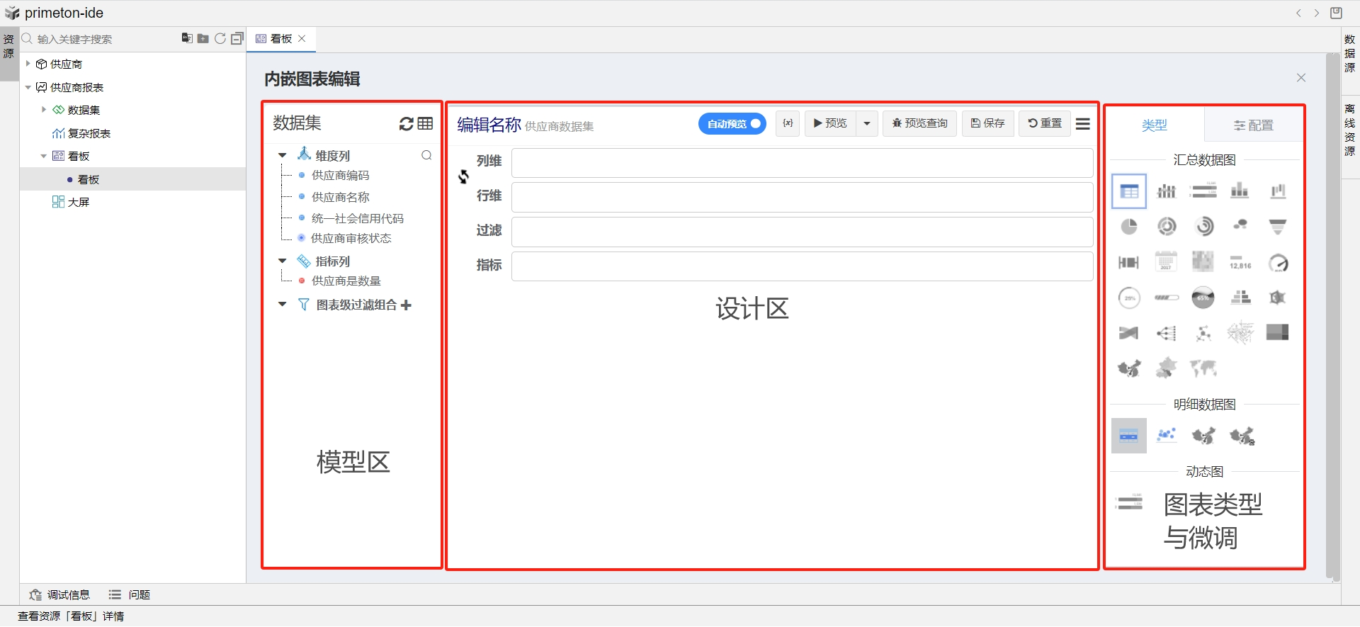 - 功能区介绍:在内嵌图表编辑页面中,分为三个区域:模型区、设计区、图表类型与微调区。