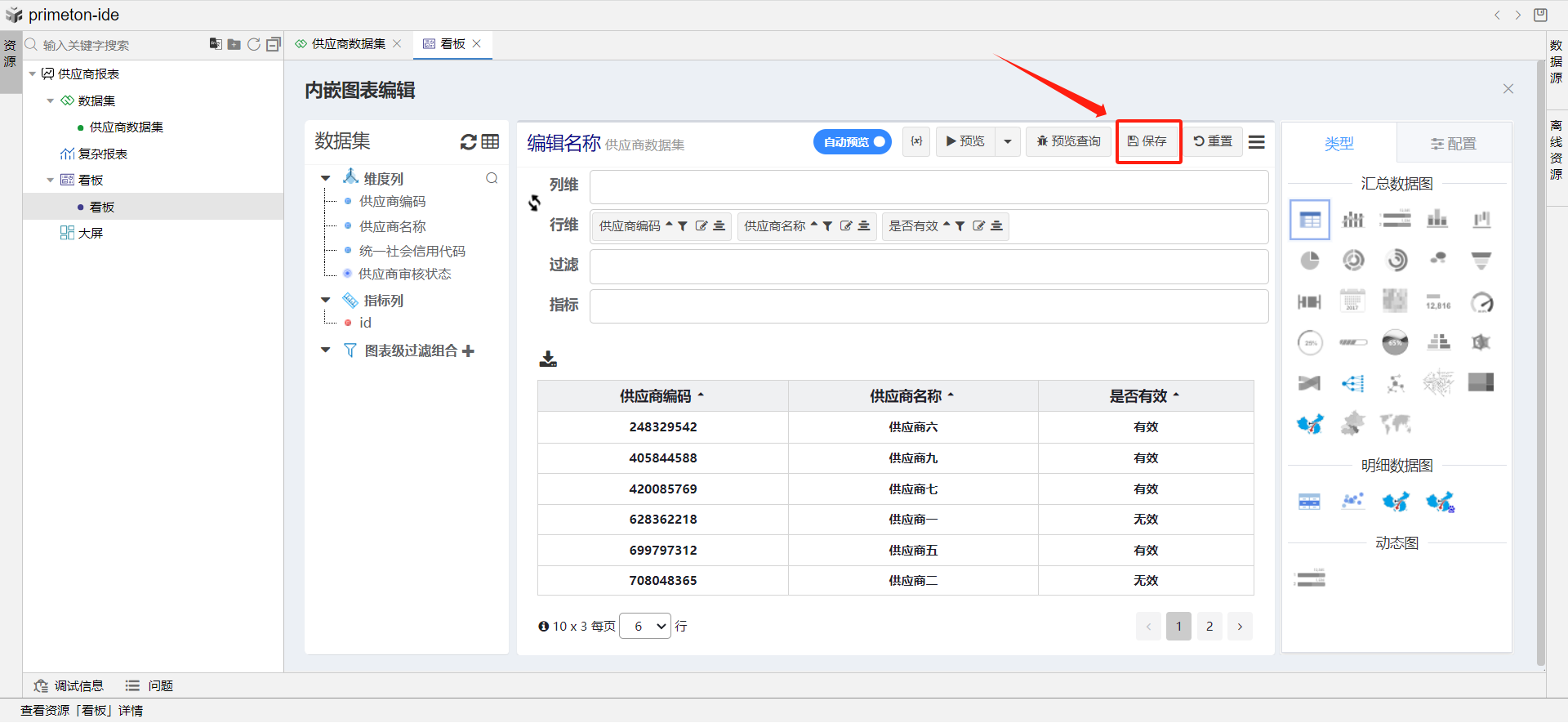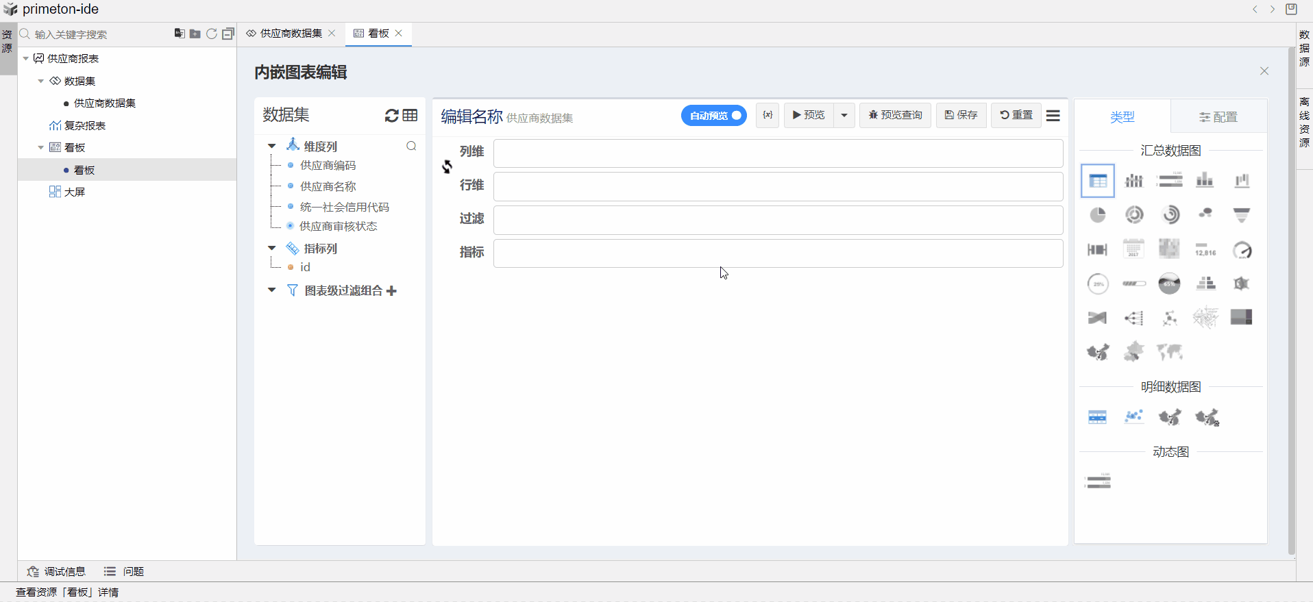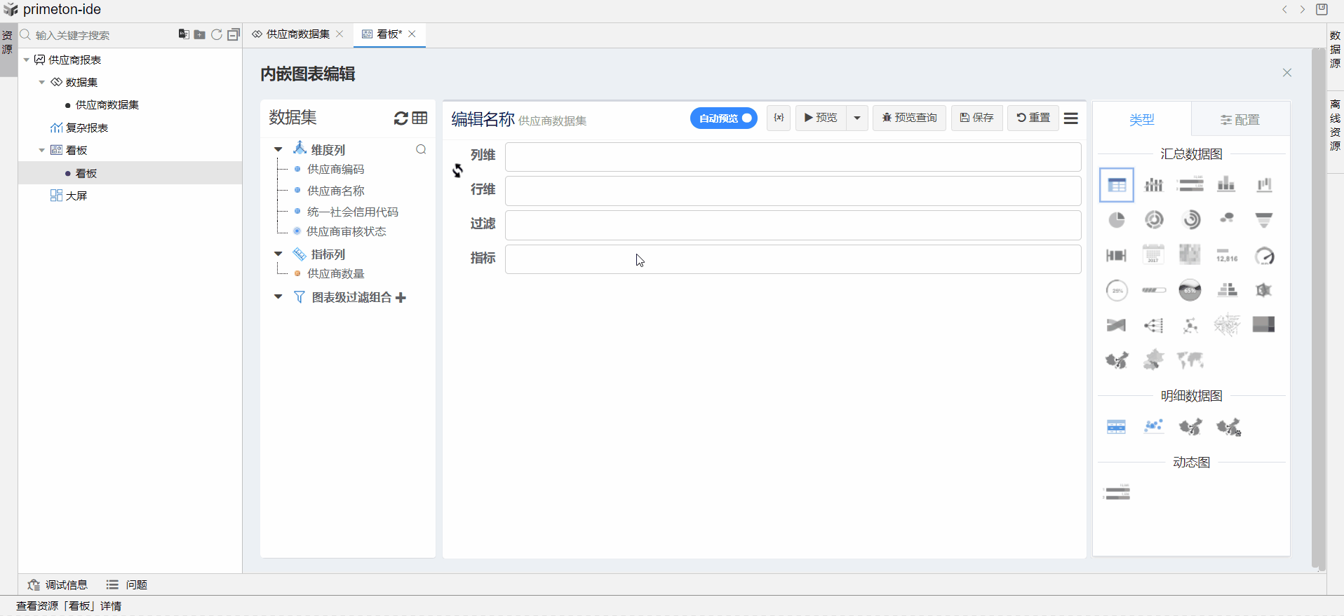 在供应商看板中,点击编辑,点击图表,选择下拉菜单添加内嵌图表,选择供应商数据集。